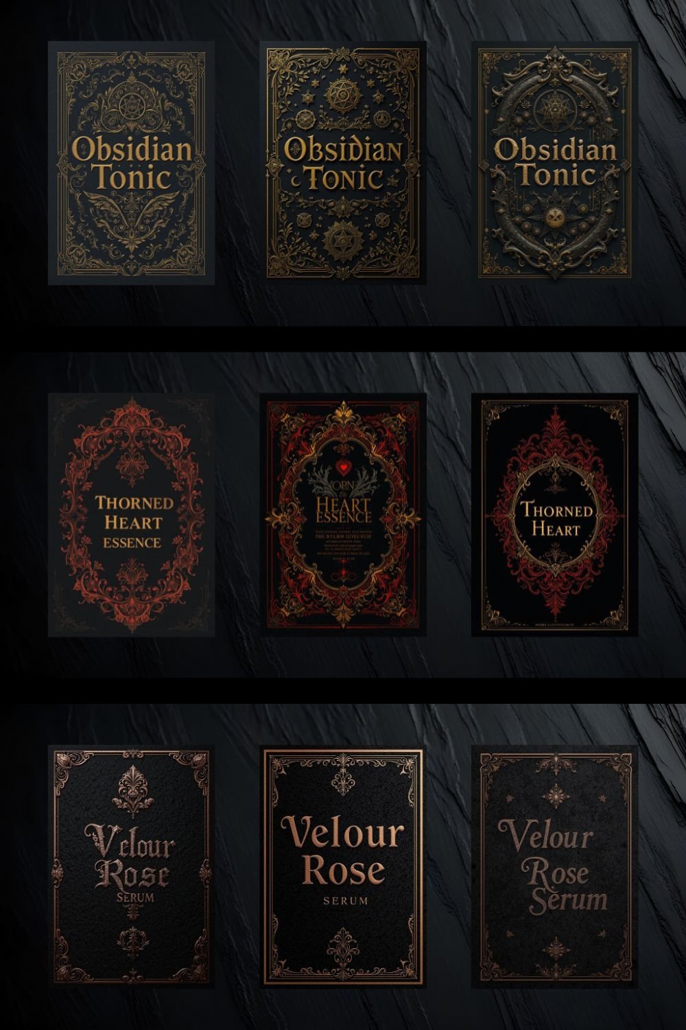 ShadowCraft labels are meant to be experienced physically — printed, placed, and absorbed. Their design language draws from ritual symbolism and controlled gothic aesthetics rather than decorative excess.