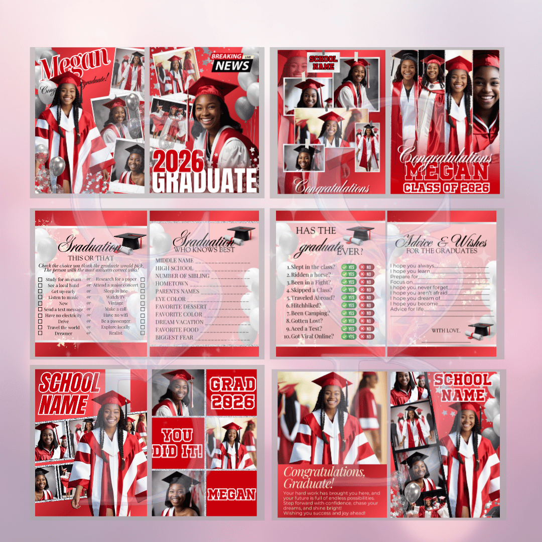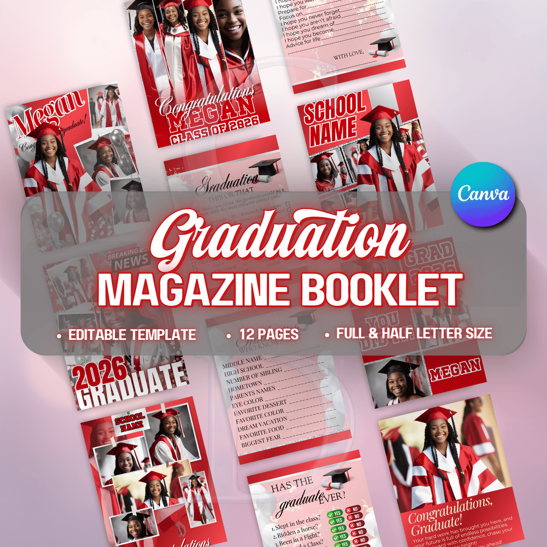 Celebrate your graduate with something that feels personal, polished, and beautifully put together. This 12-page Graduation Activity Booklet is designed to turn a graduation party into an experience. Thoughtful prompts. Interactive pages. A keepsake your graduate will actually want to keep. With a bold red design and clean layout, this editable Canva template makes it easy to create a custom booklet that looks professionally designed—without the overwhelm.