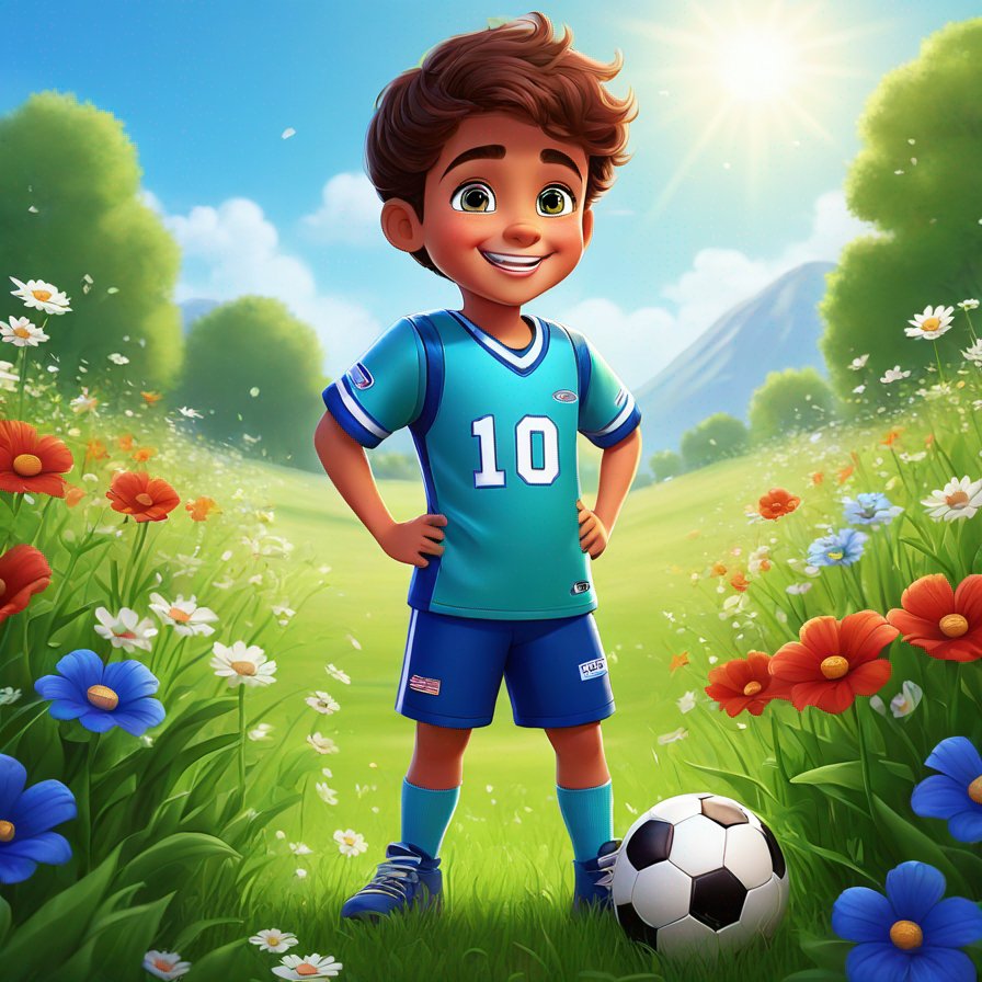 In einem kleinen Dorf, umgeben von grünen Wiesen und blühenden Blumen, lebte ein junger Junge namens Jay. Er hatte braunes Haar und blaue Auge, die strahlten, wenn er über Fußball sprach. Jay liebte es, mit seinen Freunden auf dem Dorfplatz zu spielen, aber er hatte ein Geheimnis: Wenn er die Fußballausrüstung eines bestimmten Spielers namens Jamal anlegte, geschah etwas sehr Merkwürdiges.