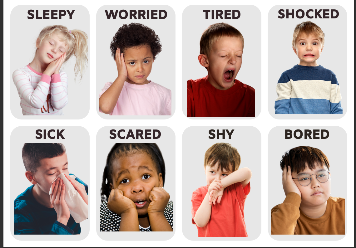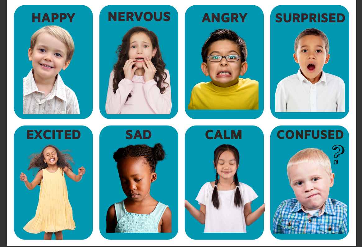 16 Different Emotions (happy, sad, angry, surprised, excited, nervous, calm, confused, sleepy, worried, tired, shocked, sick, scared, shy, & bored).