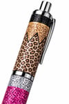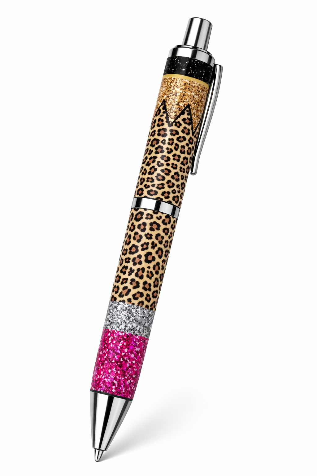 This eye-catching design features a mix of leopard print, gold glitter crown detail, silver glitter, and hot pink sparkle accents for a trendy and glam look.