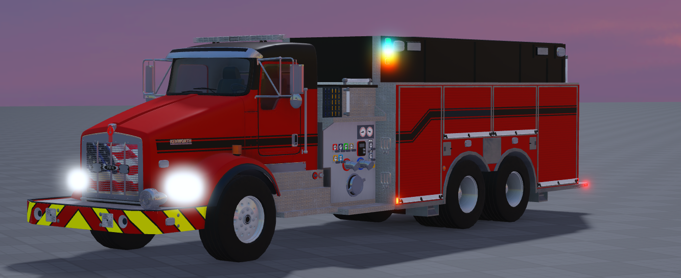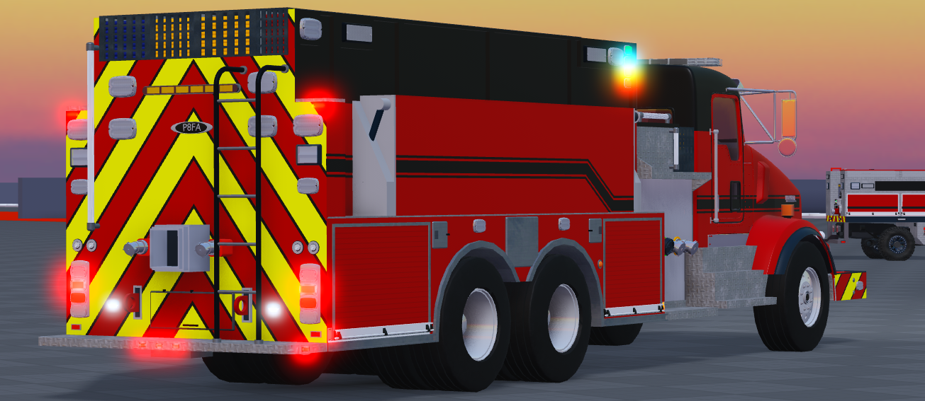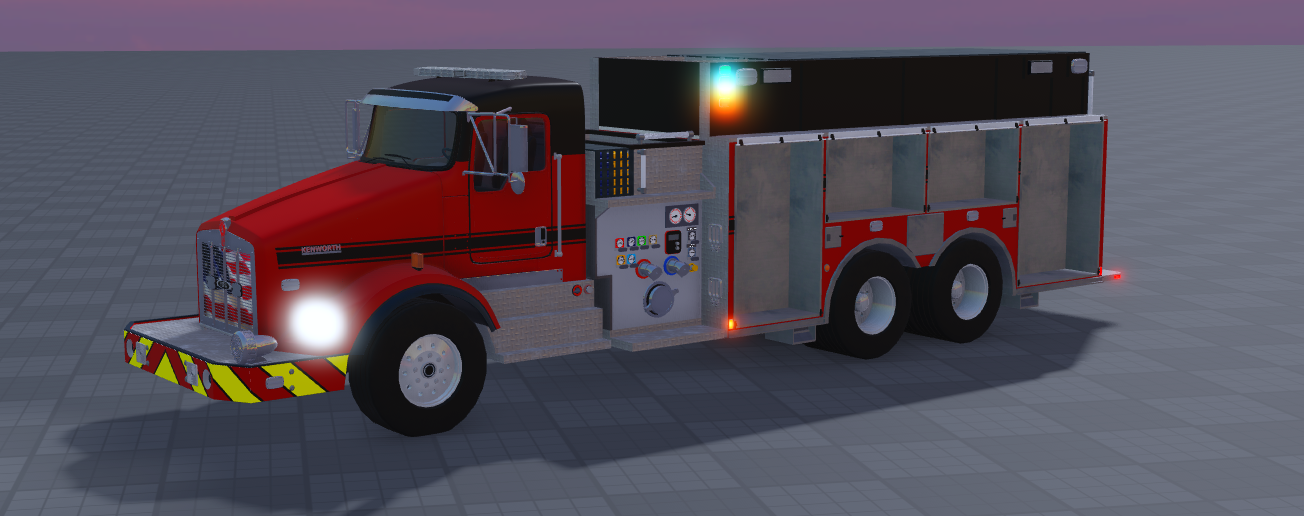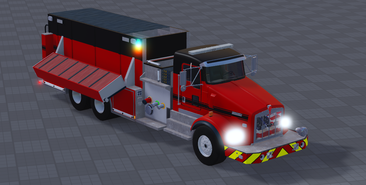 This is a Frontline 2021 Pierce/Kenworth Commercial cab Tanker. The model is completely handmade in roblox studio (aside from the cab) all the features work on the vehicle including the doors, compartments, ELS, Drop Tank, and chassis. The truck is on Firestone chassis and and the rear of the model does not have a UVMAP. Recolor of the rear or striping will have to be done by hand.