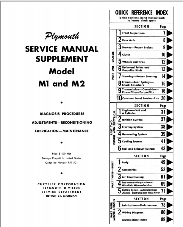 1959 Plymouth Savoy Belvedere Fury Super Fury Service Manual Supplement