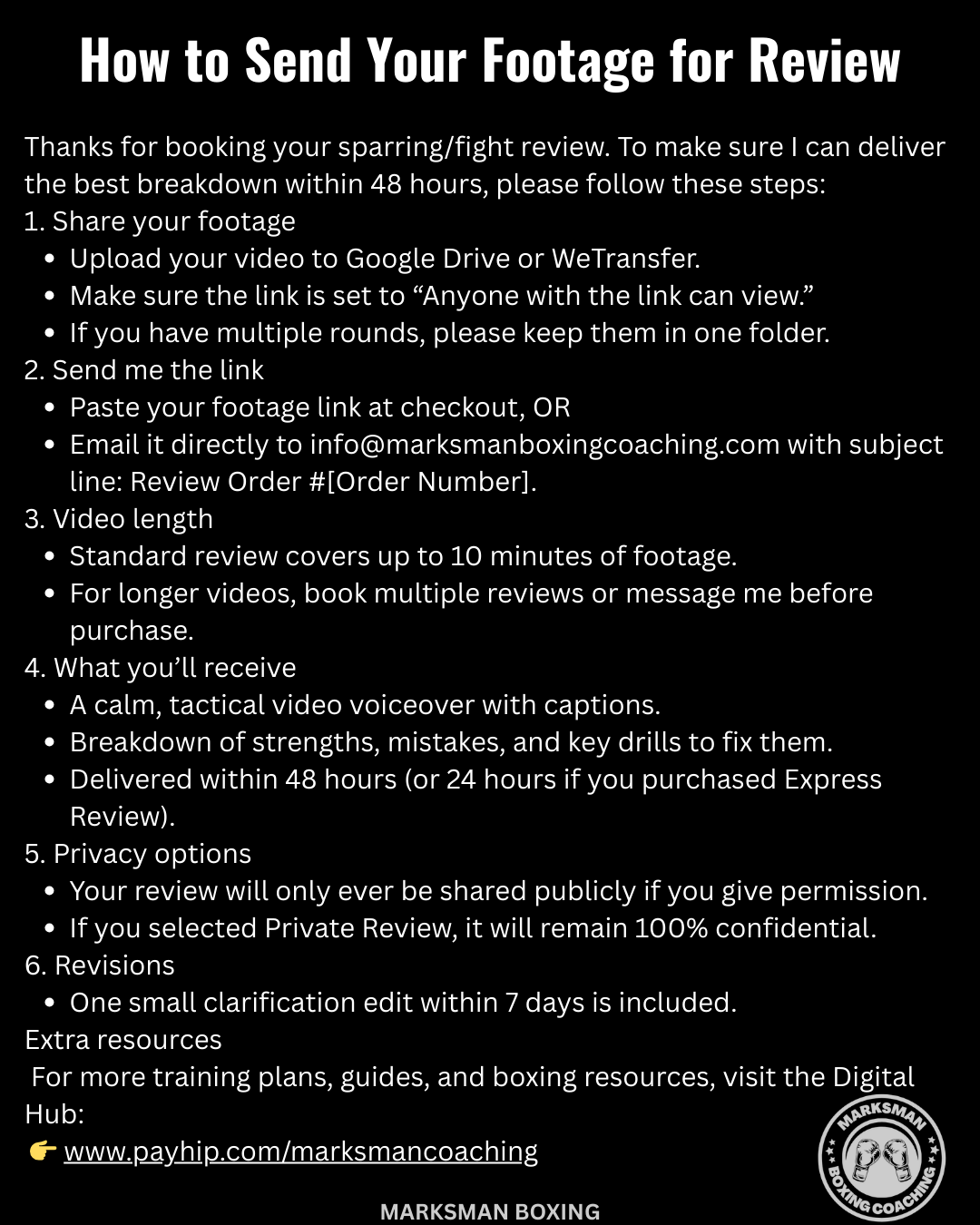 Upload your sparring or fight footage and get a calm, tactical video voiceover review with captions from Aarron ‘The Marksman’ Morgan, former national champion and pro boxer.