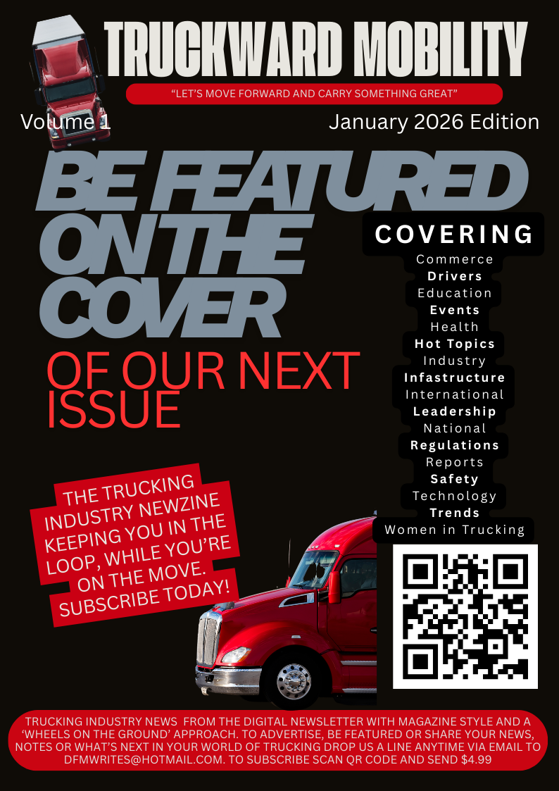 "Truckward Mobility" offers trucking industry news from the digital newsletter with magazine style and a ‘wheels on the ground’ approach. To advertise, be featured or share your news, notes or what’s next in your world of trucking drop us a line anytime via email to dfmwrites@hotmail.com. To subscribe scan qr code and send $4.99 per issue.