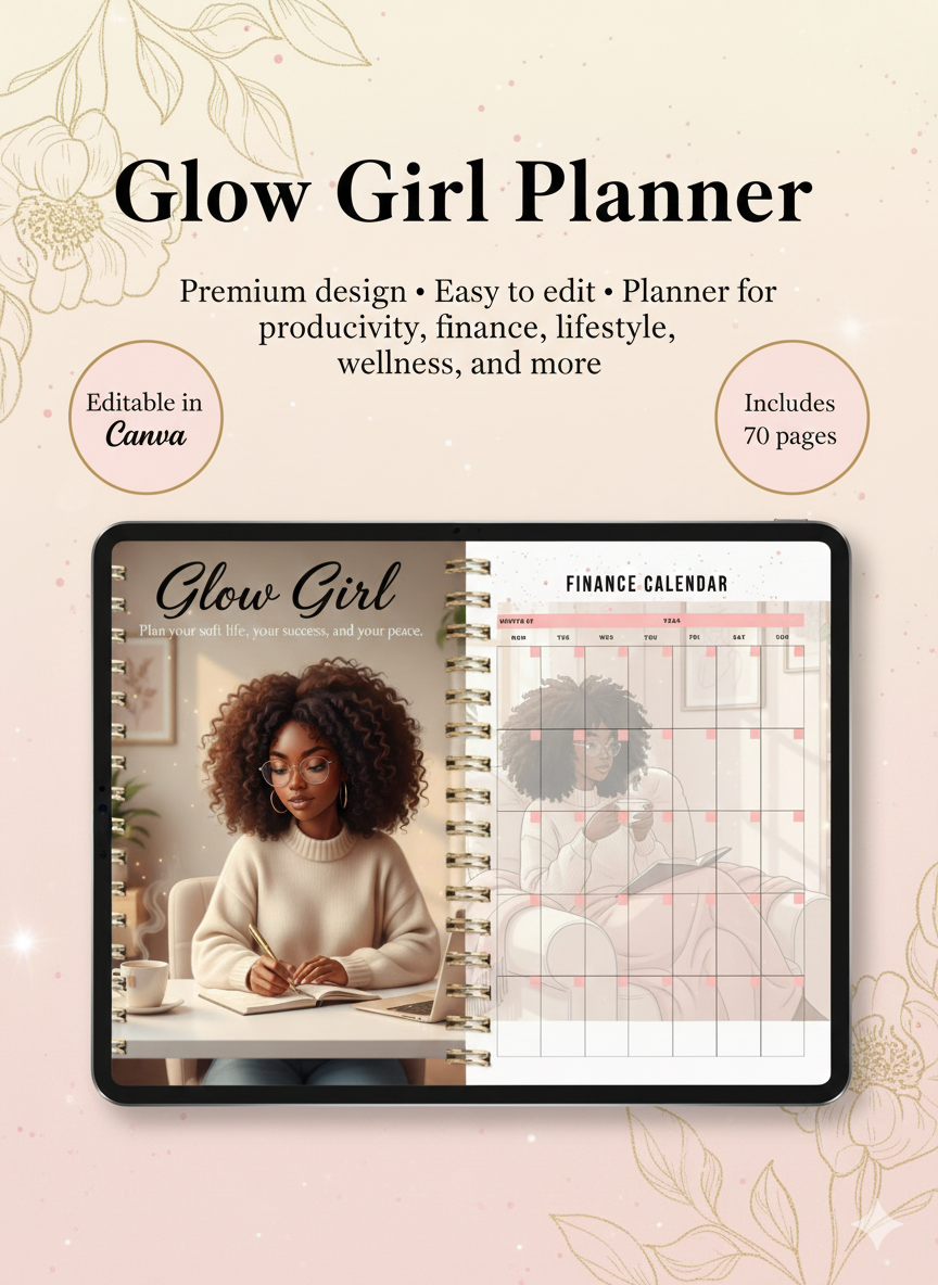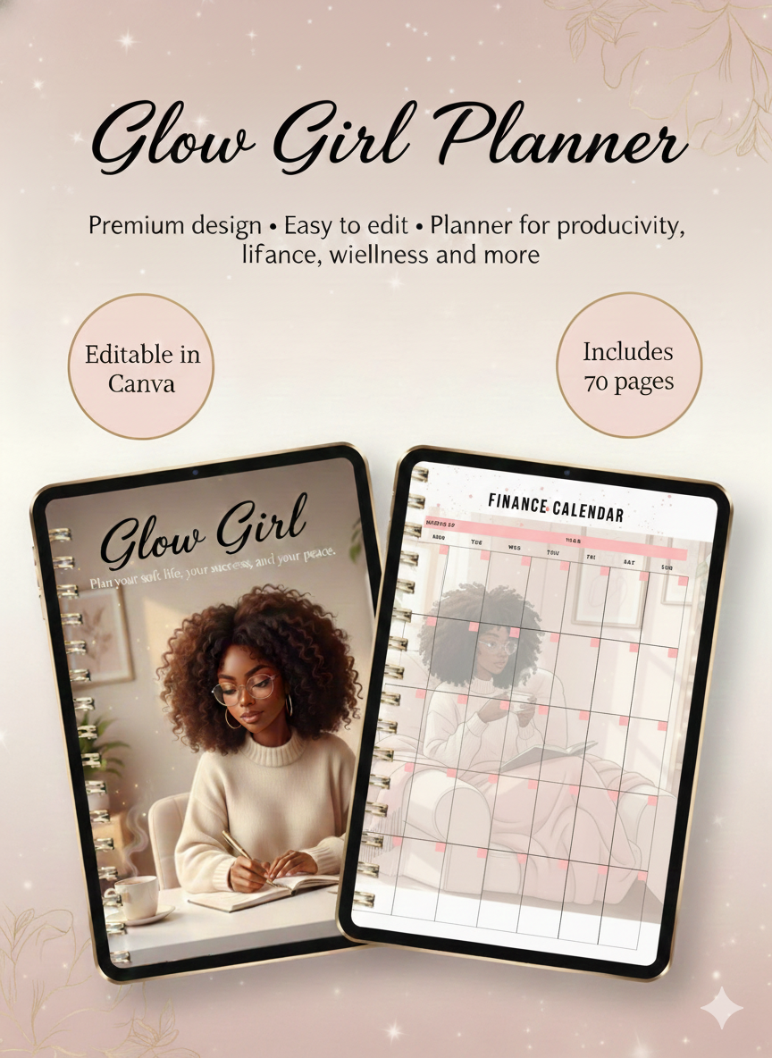 Glow Girl Planner isn’t just a planner — it’s your daily dose of clarity, motivation, and soft-life energy. Get ready to turn plans into results and chaos into calm, all while looking fabulous 💅🏽.