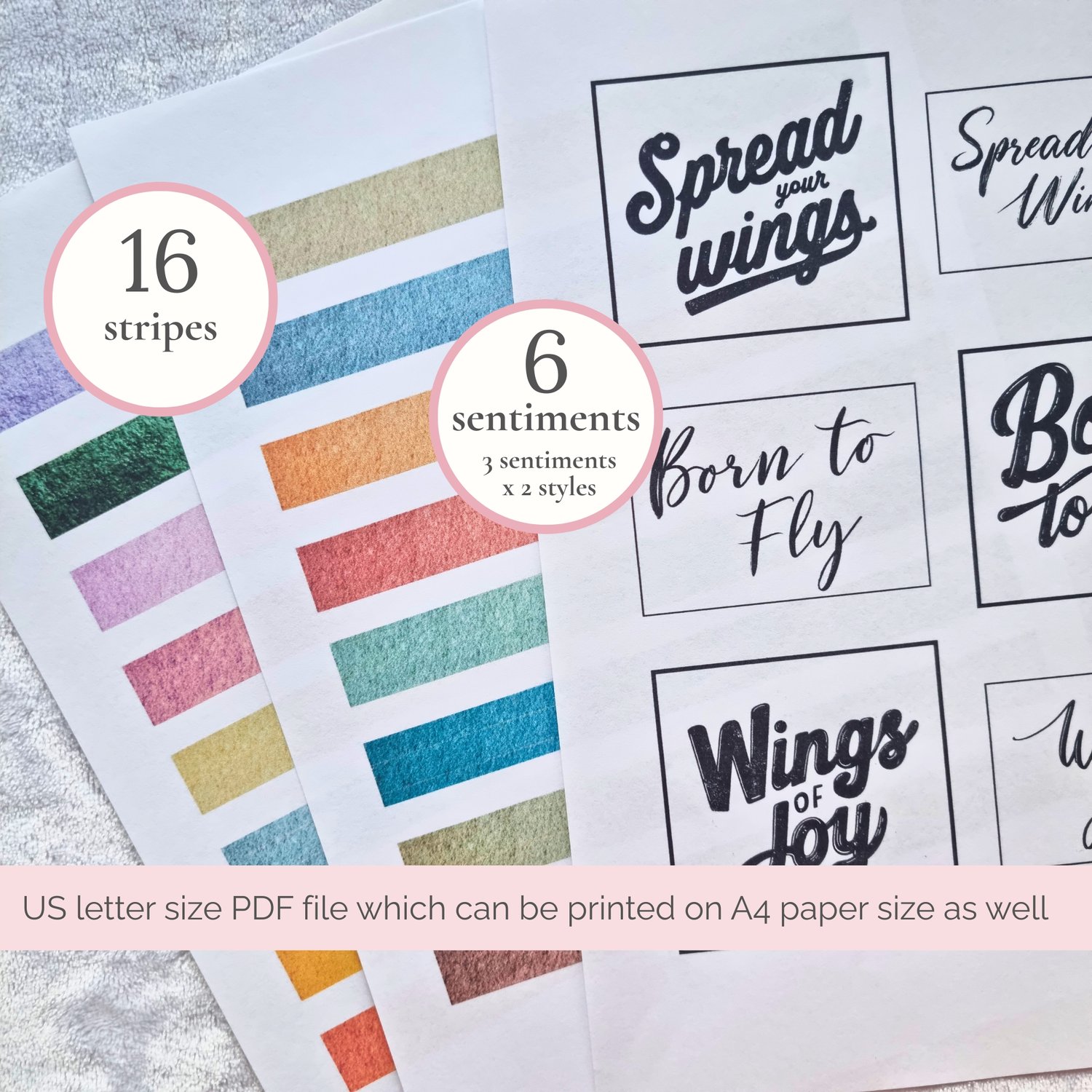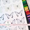 - PDF file with 125 colorful butterflies, 15 greyscale butterflies to color, 16 matching stripes and 6 sentiments (Born to Fly, Spread Your Wings and Wings of Joy in two font styles)