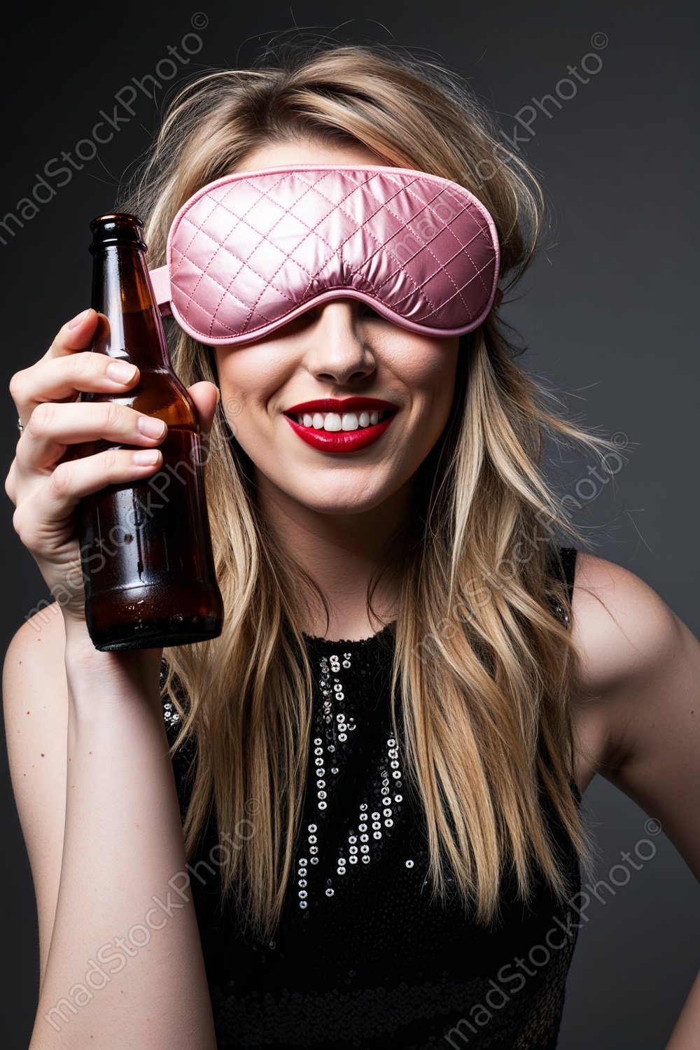 party, woman, pink sleep mask, beer bottle, sparkling dress, smiling, red lipstick, blonde hair, glamour, nightlife, fun, carefree, outgoing, bold makeup, cheerful, modern fashion, confident, playful, vibrant energy, festive, celebration, happy woman, trendy, stylish, sequin outfit, beauty portrait, confident woman, radiant, casual fun, bold look, glamorous, carefree vibes, trendy outfit, vibrant nightlife, beauty, fashionable, dynamic pose, happy expression, elegant, fun-loving, relaxed, bold attitude, party vibes, exciting, festive look, urban style, dazzling