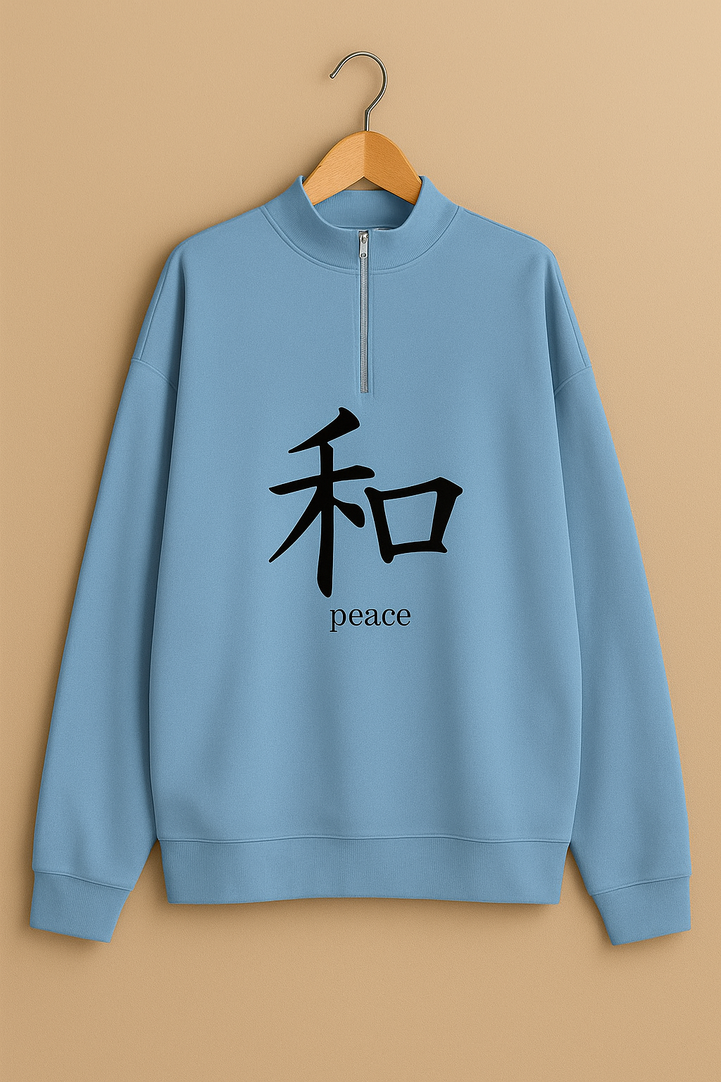 This clean mockup features a light blue quarter-zip sweatshirt with the Japanese Kanji “Peace (和)” design.
