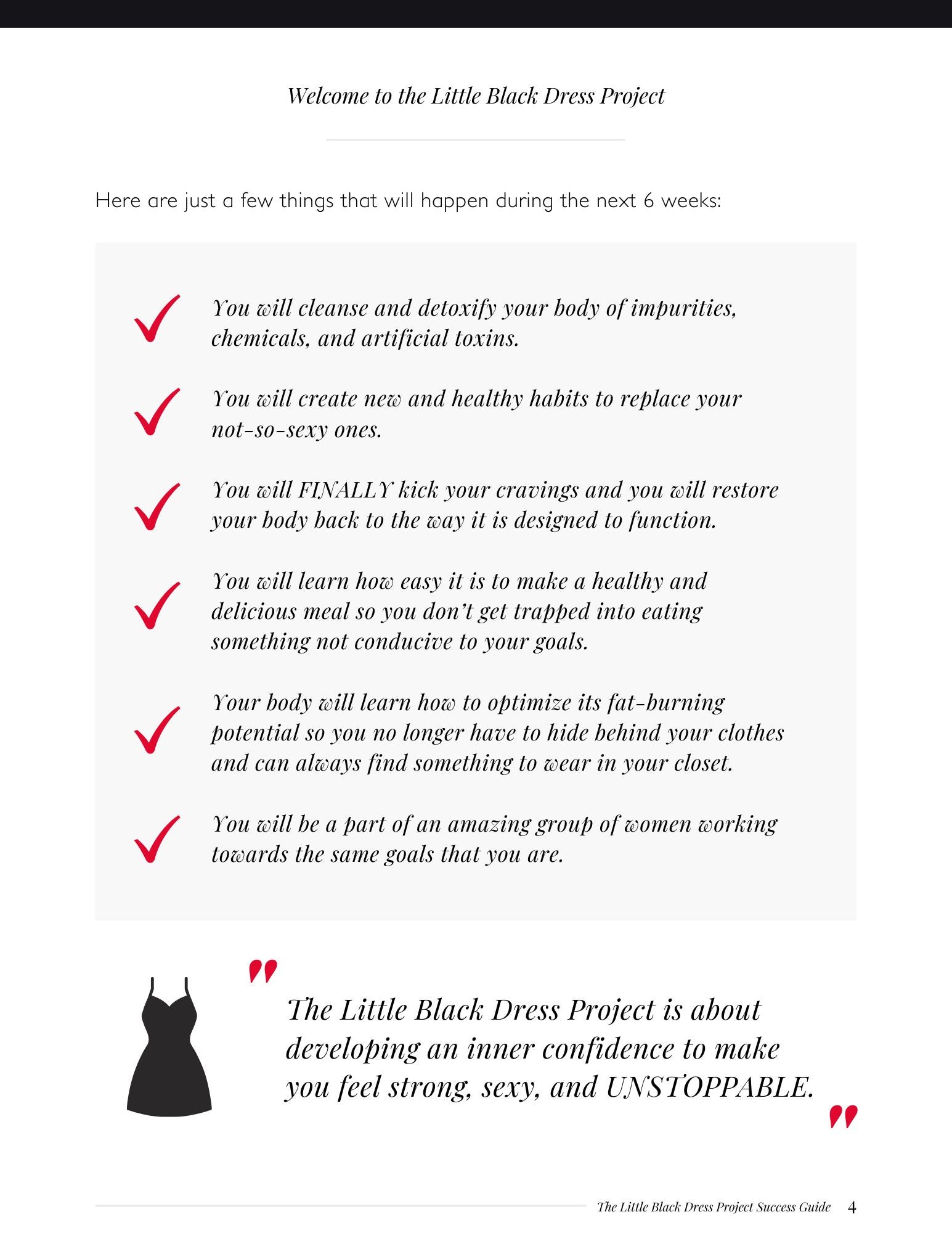 With the 1-on-1 version of The Little Black Dress Project, you will receive your Success Manual, Goal & Progress Worksheets, Recipe Manual with over 50 recipes and Weekly Meal Plans along with Shopping Lists, daily inspo email/texts AND your personal client portal. You will ALSO receive Weekly 1-on-1 15-30 min coaching calls to help with any obstacles you may be facing, help track your progress, and keep you 100% accountable for the entire 6 weeks! This is an incredible, first time offer for this 1-on-1 coaching!! Do not hesitate on this one, prices this low are good for only a limited time!