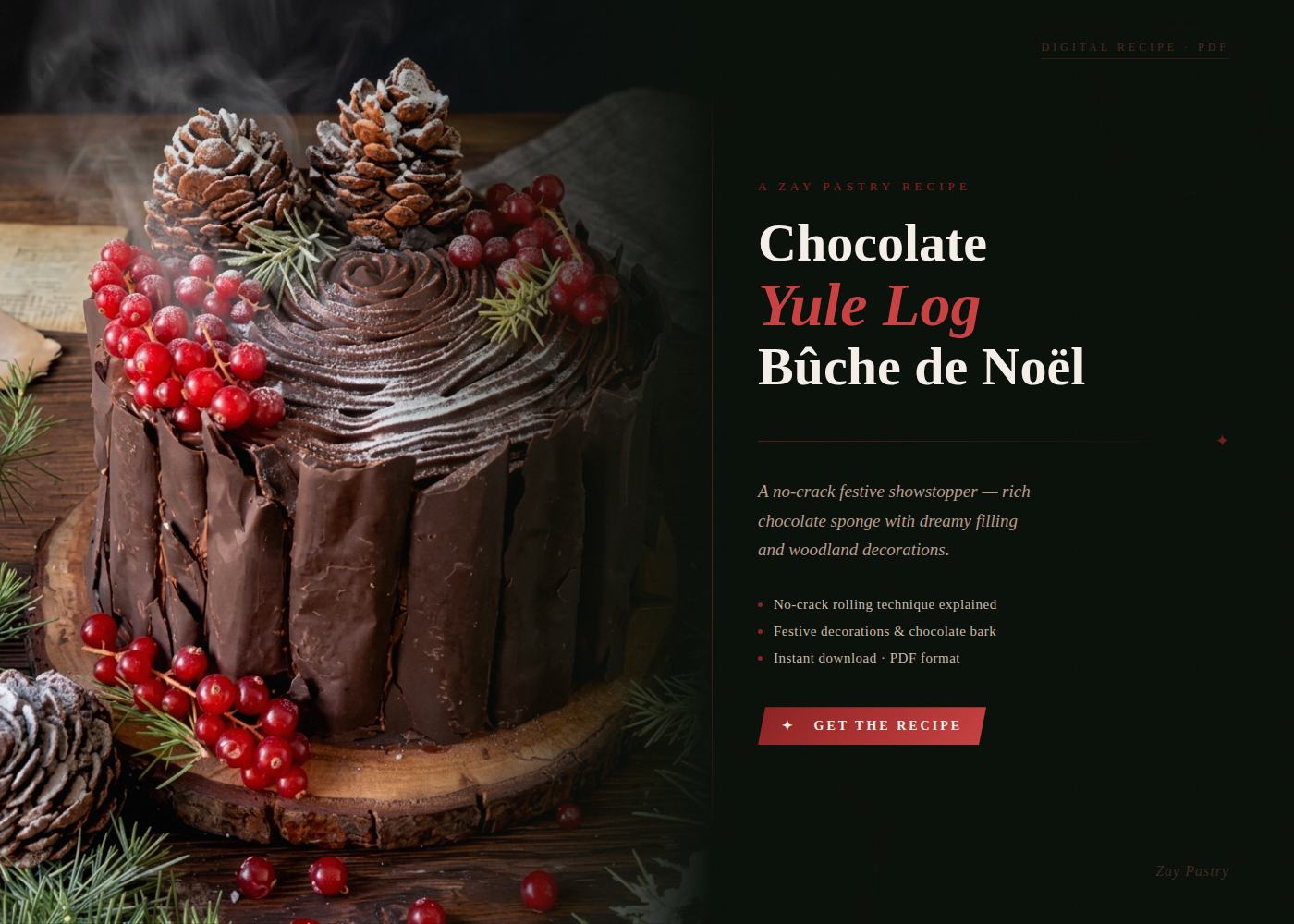 Make a stunning Chocolate Yule Log Cake at home — without cracks, without stress. This step-by-step PDF guide teaches you the exact technique professional bakers use to roll a perfect Bûche de Noël every time.