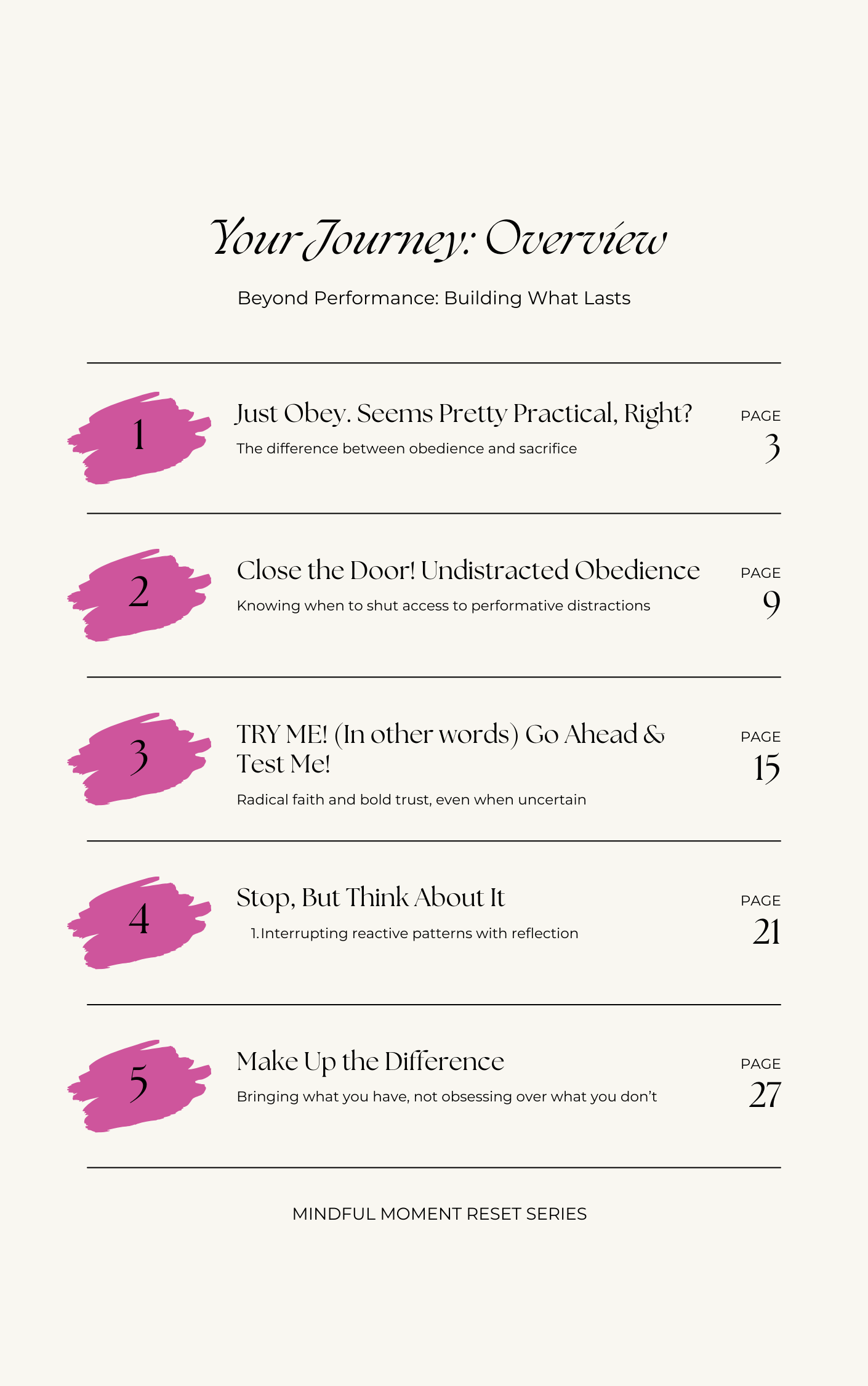 This 5-module workbook is your invitation to pause and reset the way you lead, live, and connect. Through real-life reflections, guided prompts, and practical challenges, you’ll uncover the difference between striving for results and walking in true obedience.