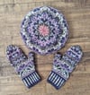 This is a pattern to knit a tammy, beanie, cowl (2 length options) and mittens using the stranded colourwork technique. This pattern is intended for experienced knitters familiar with colour or symbol charts and basic shaping. The charts are shown with colour and symbols on the same chart.