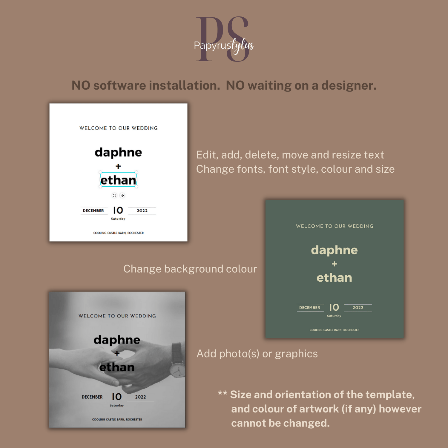 Featuring simple and minimalist layout, this modern wedding welcome sign give guests a unique greeting at the wedding venue on your Big Day! The easy-to-customise template comes with two sizes available, you may use one as wedding sign and the other one as guestbook at the reception.