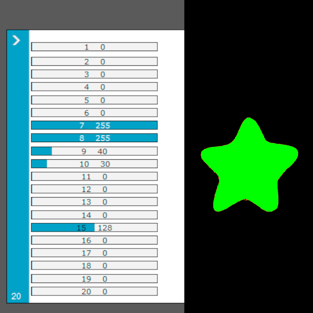 * Verifique que coincidan estos canales: 8 Dimmer, 7 Strobo/Shutter, 9 en el valor 40 = Verde, 10 en el valor 30 = Gobo de Estrella, 15 Foco (ver cuarta foto).