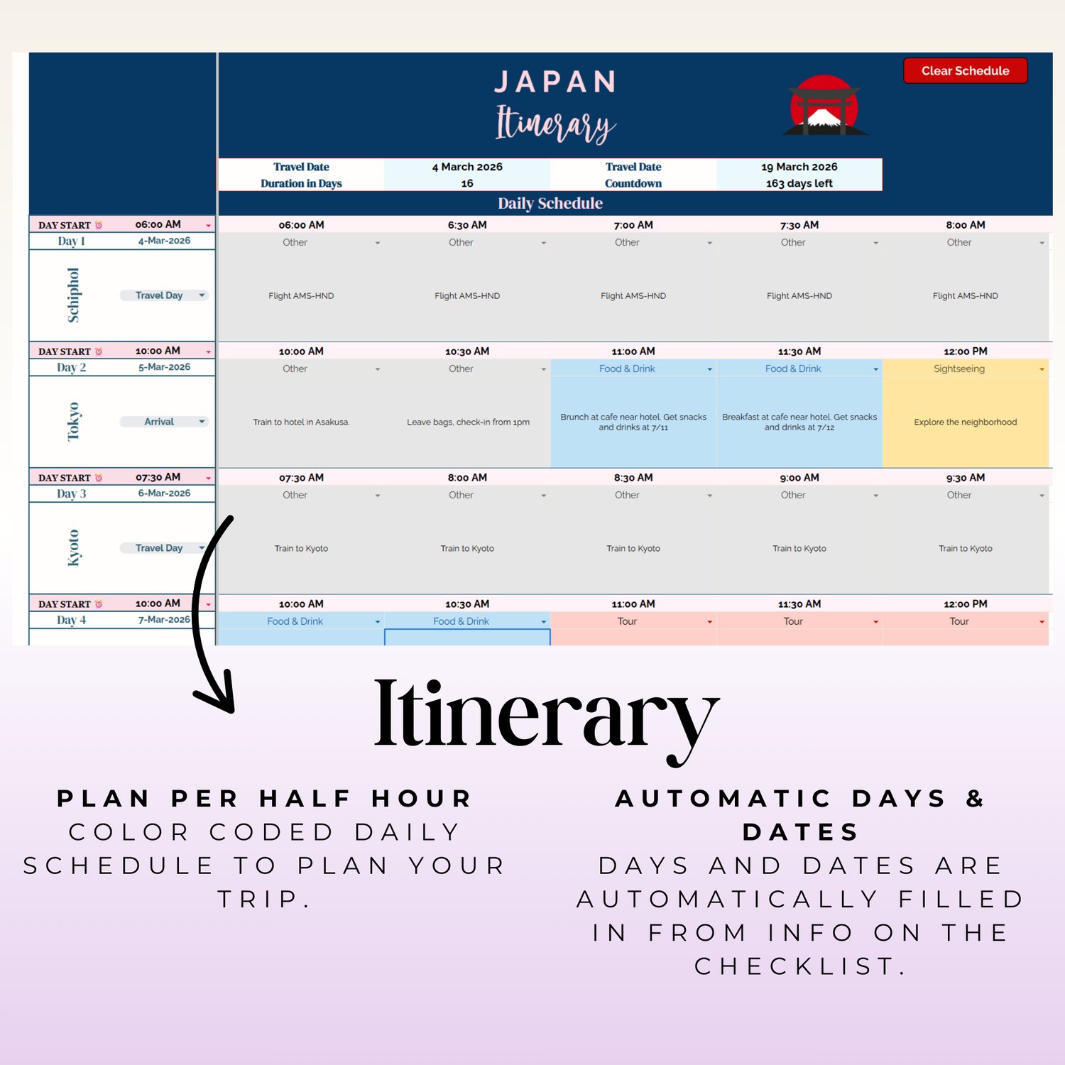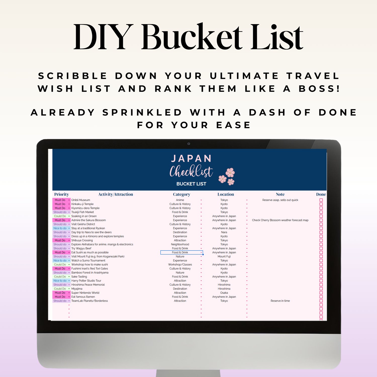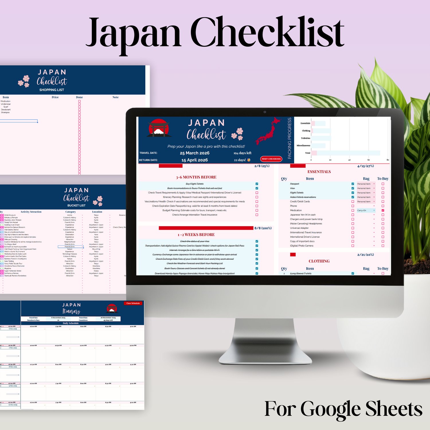 Planning your dream trip to Japan has never been easier! This all-in-one Google Sheets template is your ultimate digital travel companion, designed to make your planning seamless, organized, and stress-free. From essential pre-trip tasks to an exciting bucket list, this planner has everything you need to prepare for an unforgettable adventure.