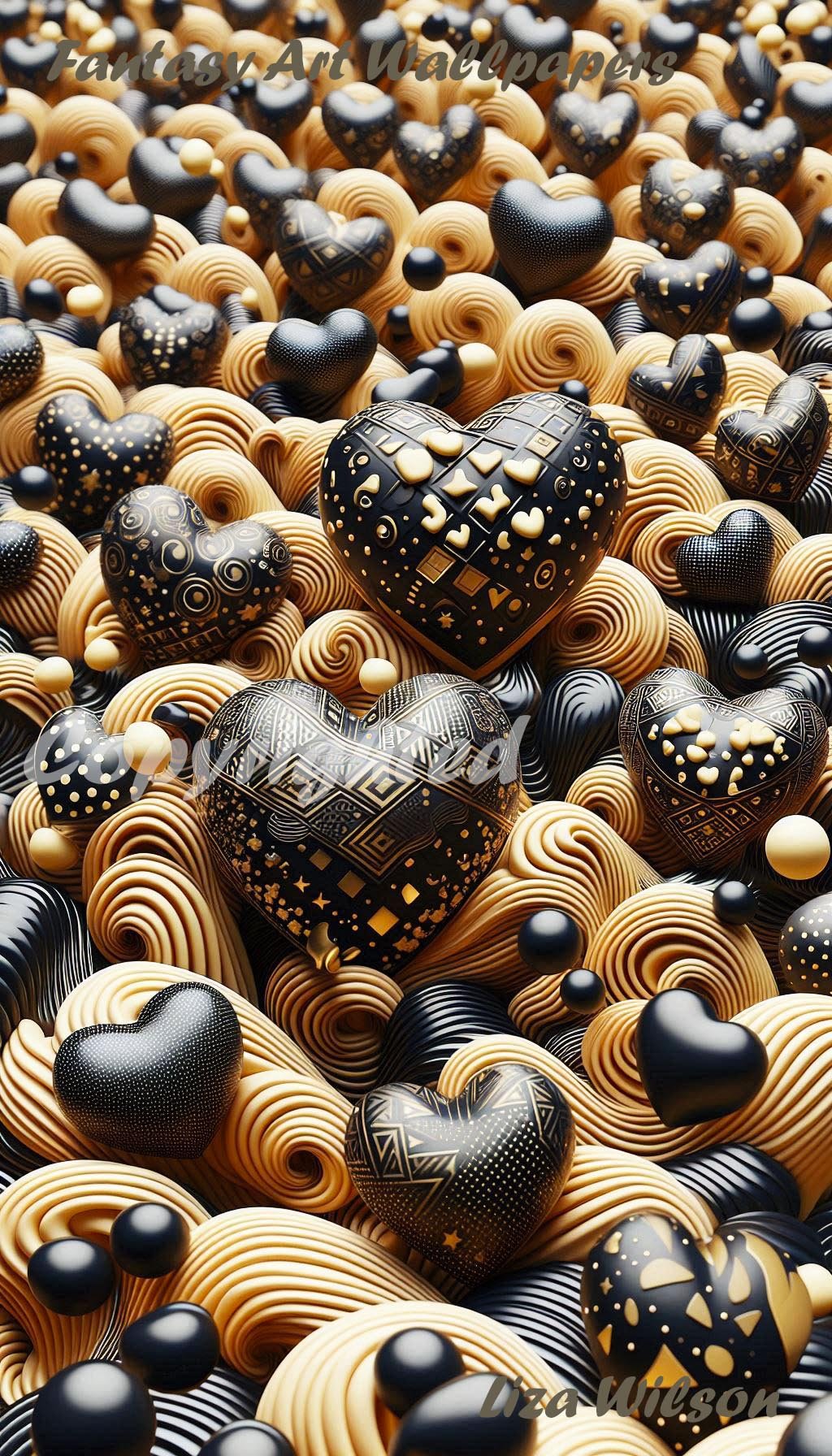 3D bouncing black & gold patterned chocolate hearts nestling on a swirling patterned cream background.