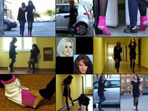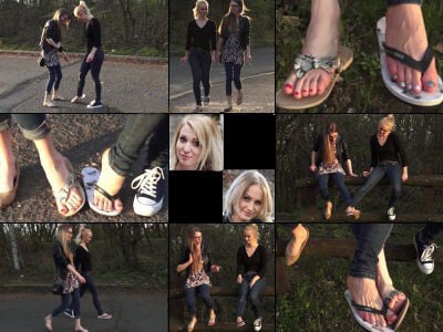 (English) Minnie & Zuzu, two girls with the same foot problem have a chance meeting in the street on their work breaks. Their doctor has dealt with the pain in the balls of their feet in the same way, by prescribing a half shoe to take the pressure off. They both check out each others half naked feet blasting out of their single half shoes and even touch naked toes. They both also discuss the same problem their having, that in this summer heat the pavement is so hot that it's burning the underside of their half naked soles as they gimp along. Worse yet many of the streets around them are gravel and that also hurts their vulnerable tootsies. So they decide to help each other out. Each girl will hold the others vulnerable half-shod foot for some distance while they both hop along to their favorite Cafe. Both get pretty tired helping the other hop and after some distance that stop to check out each others half naked feet. Filmed from every different angle.