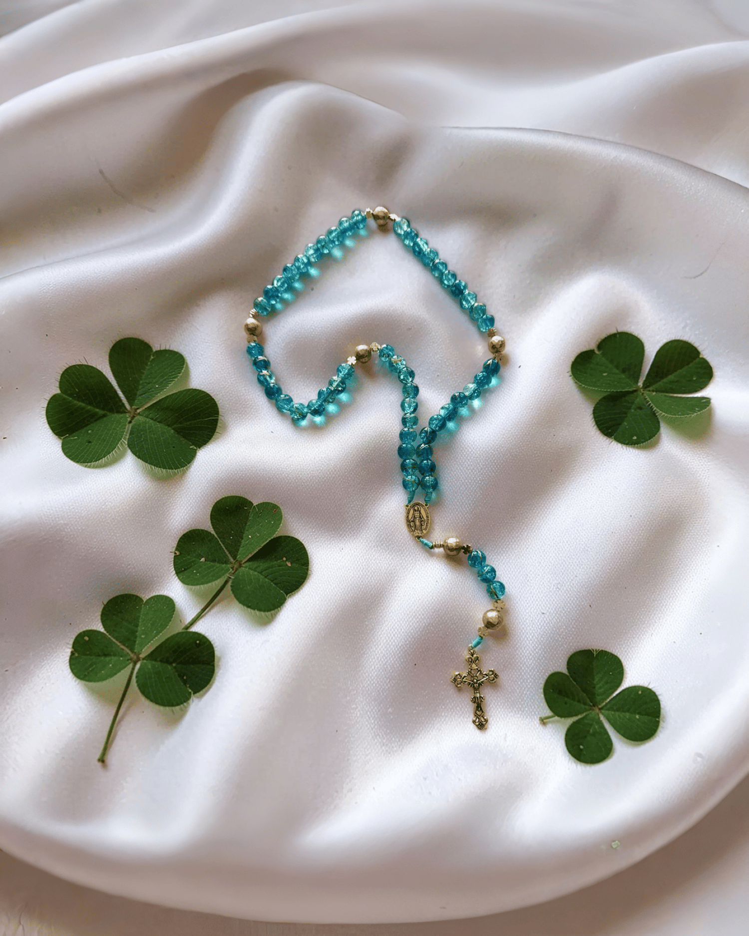 Keywords: Irish rosary, aqua rosary, St Patrick rosary, blue crystal rosary, gold rosary, handmade cord rosary, Miraculous Medal rosary, Irish Catholic gifts, spring rosary