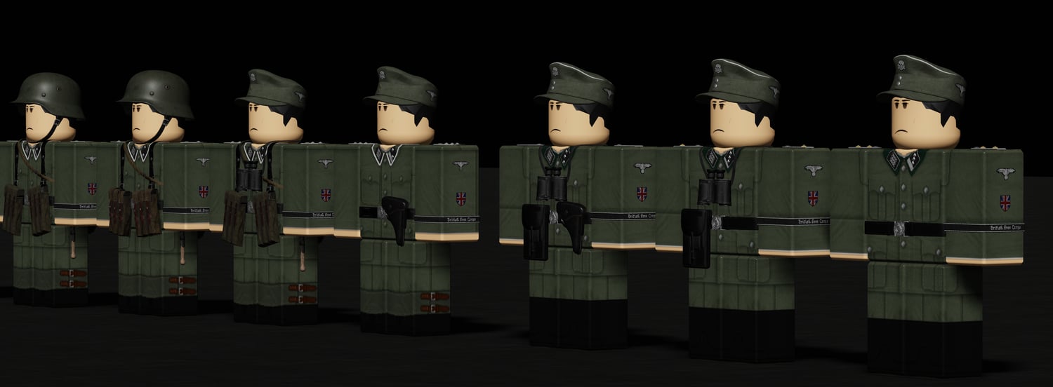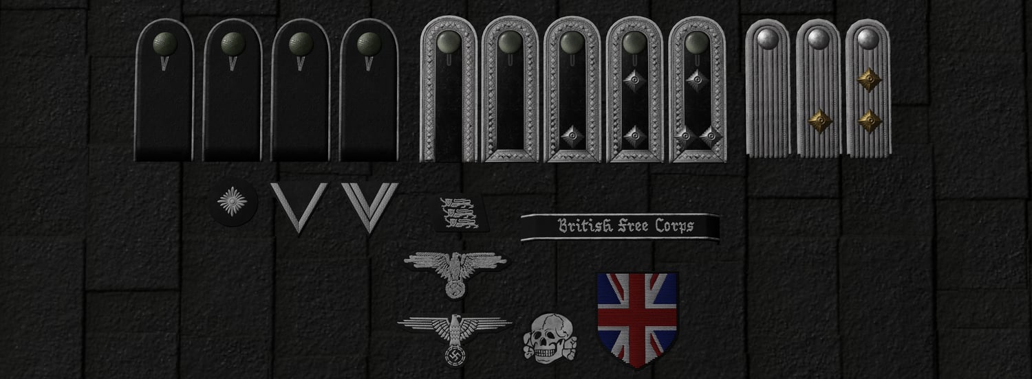 The British Free Corps (BFC) was a small unit within the Waffen-SS made up of British and Dominion POWs who were recruited to fight against the Soviet Union, though the unit never reached more than 30–50 members at its peak. Intended as a propaganda tool, the BFC was poorly equipped and largely isolated from frontline action. Members wore standard German field-grey uniforms with gaiters instead of jackboots, and typically used field caps rather than SS visored caps. The unit’s most recognizable insignia was the left collar tab, which displayed three white lions passant, modeled after the English royal arms; the right collar tab was often blank, lacking the traditional SS runes. Though the unit as a whole saw no combat deployment, a few individual members were attached to other SS units near the end of the war, particularly on the Eastern Front, where some allegedly engaged in combat. The BFC ultimately disbanded in 1945, and most of its surviving members were tried for treason or collaboration.