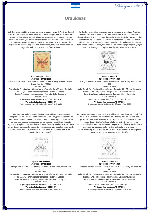 Ficha digital en PDF sobre los sellos emitidos en Nicaragua en 1969 dedicados a las orquídeas (Catálogo Sooluciones NI-04020-04021-04022-04023).