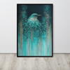Bring the stunning beauty of the Teal Songbird to your home with this high-resolution digital file. The intricate details of the bird's feathers are captured in exceptional detail, and the abstract background of dripping teal paint with gold flakes creates a beautiful contrast that will make this artwork a focal point in any room. Print it at any size to suit your decor needs.