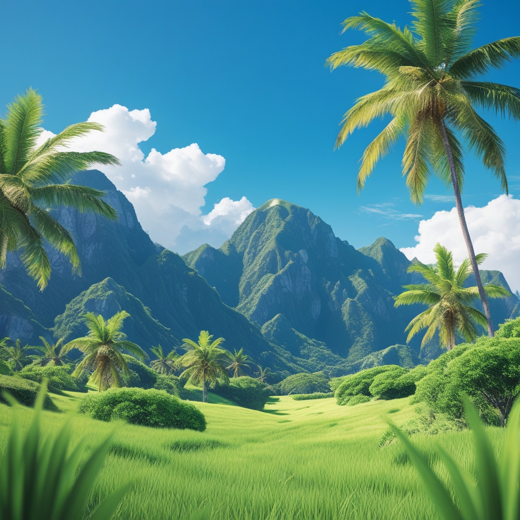 tropical landscape background including mountains, clear blue sky. GREEN GRASS The overall style is modern and bright, the background provides a sense of context and environment. The colors are bright and saturated, an attractive visual presentation for advertising the product.
