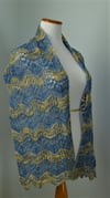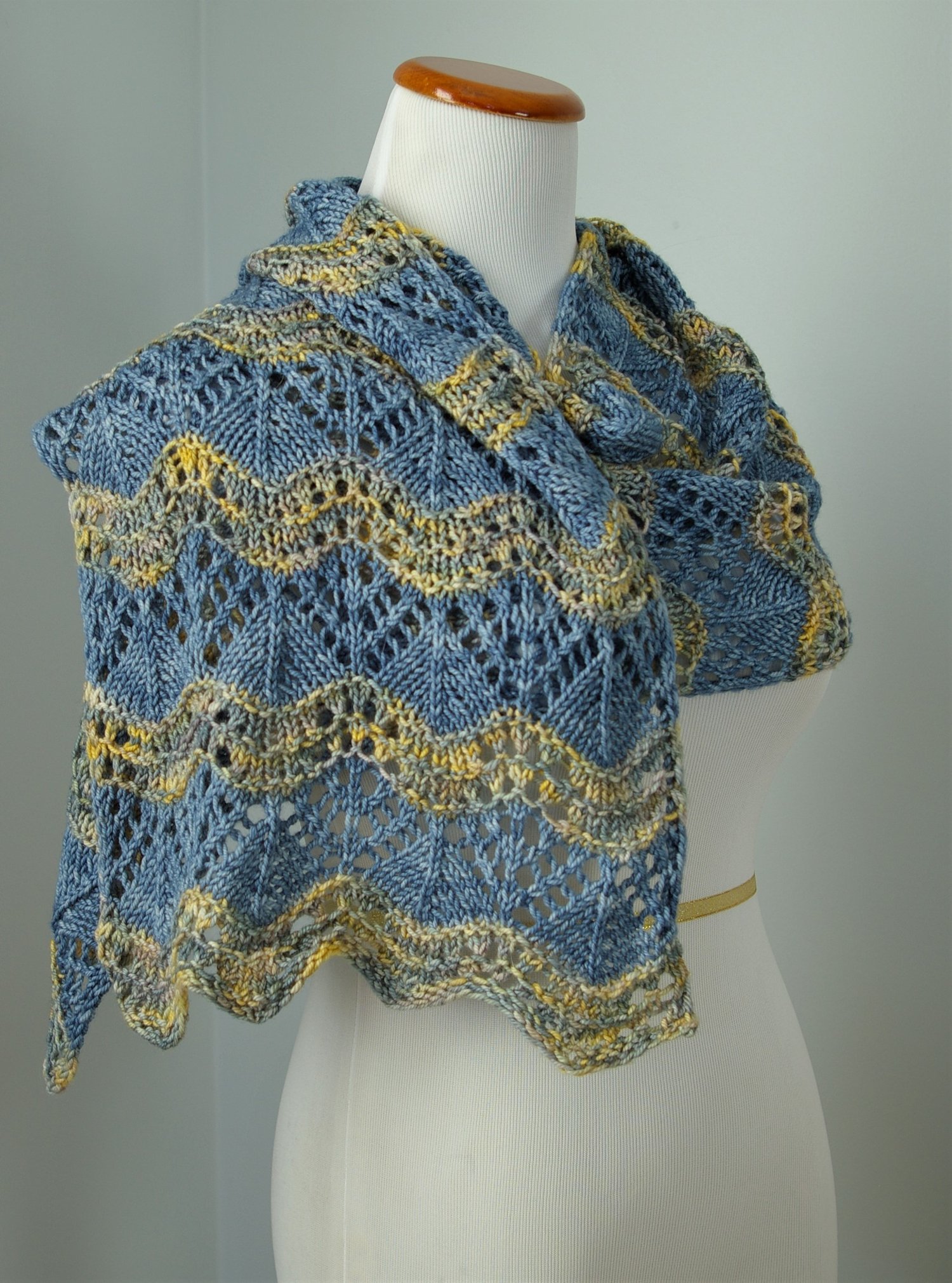 Two ripple lace patterns and two complementary colorways of yarn work off and with each other in this rectangular wrap in a way that reminds me of the little fish that dart in and out of the sunlight in the Shenandoah River near my home. Luxilus is a genus of fish that includes the common shiner.