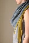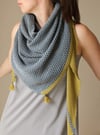 A wide swath features a two-color stitch that is easy to knit and looks lovely from both sides, while a striking contrast garter section creates interest. Tassels add a fun touch.