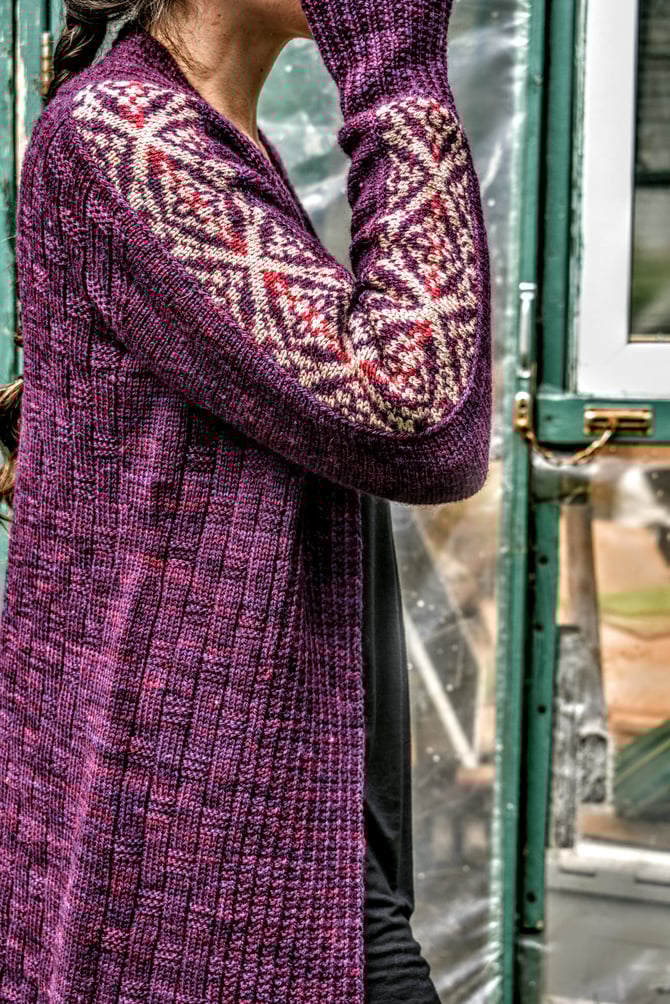 Sweet Paprika Norwood (100% Norbouillet wool; 205 metres / 225 yards per 100 grams / 3.5 ounces) in main colour (MC) Professor Plum, and contrast colours (CC1) Sand Castle and (CC2) Canasta. If using sample yarn, you will need (6, 7, 7) (8, 8, 9) (10, 11, 12) skeins of MC and 1 skein each of CC1 and CC2.