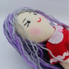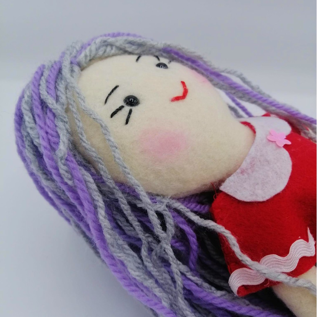 Papusa cu par lung mov, cu rochie rosie, din fetru, handmade