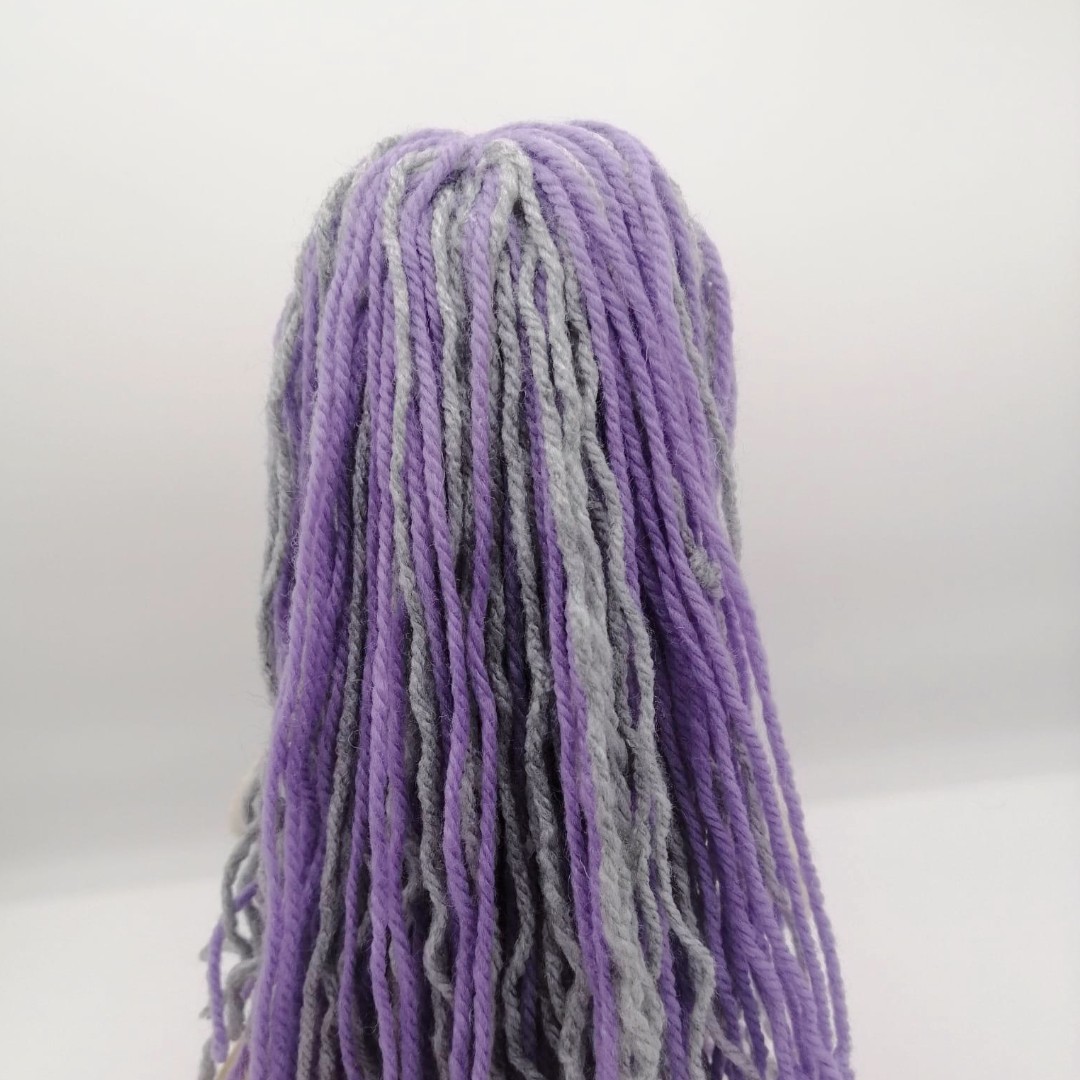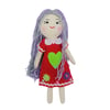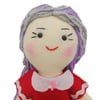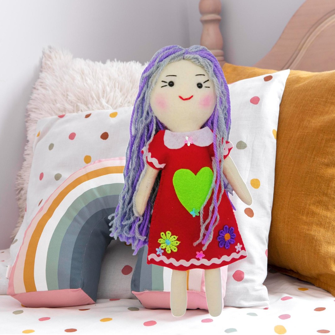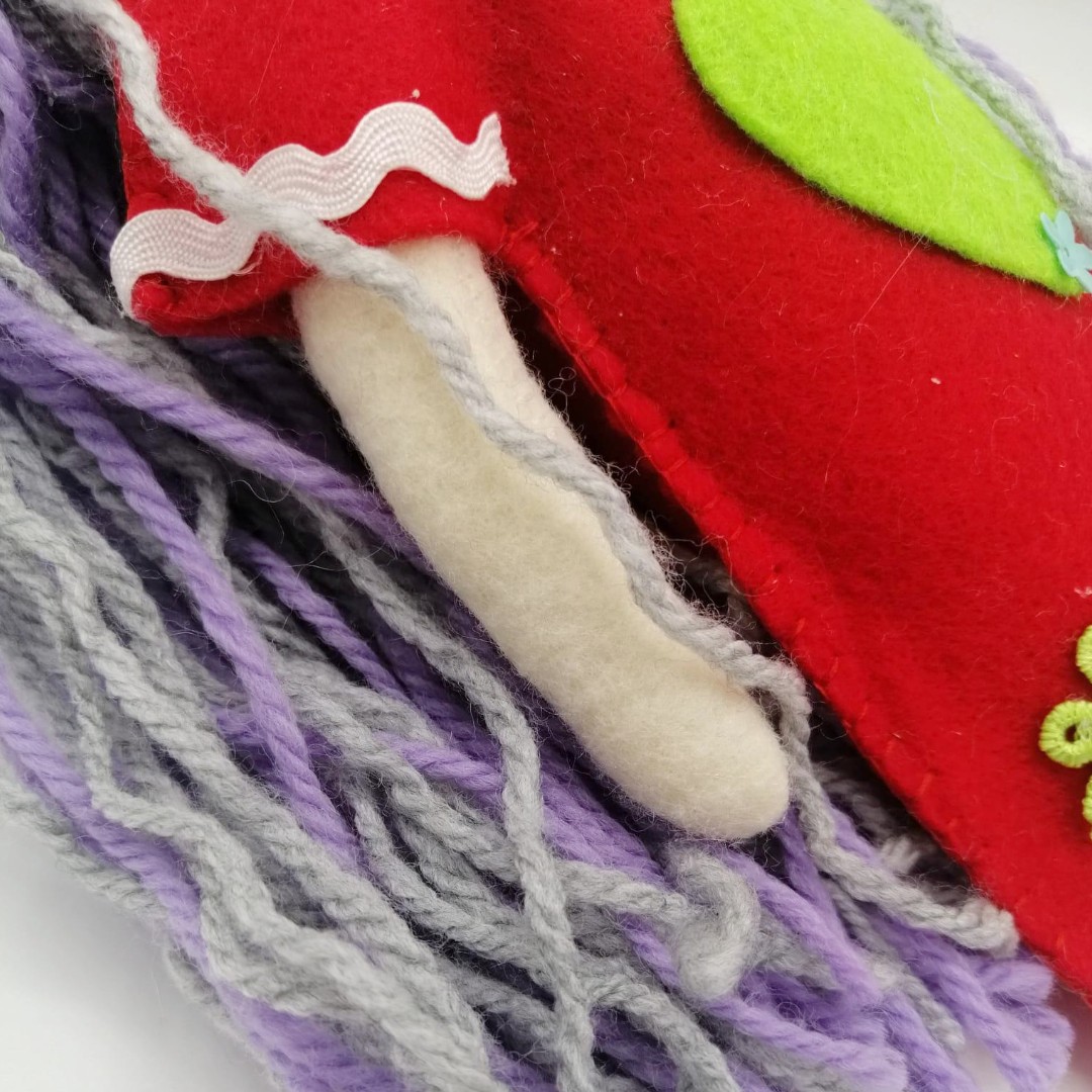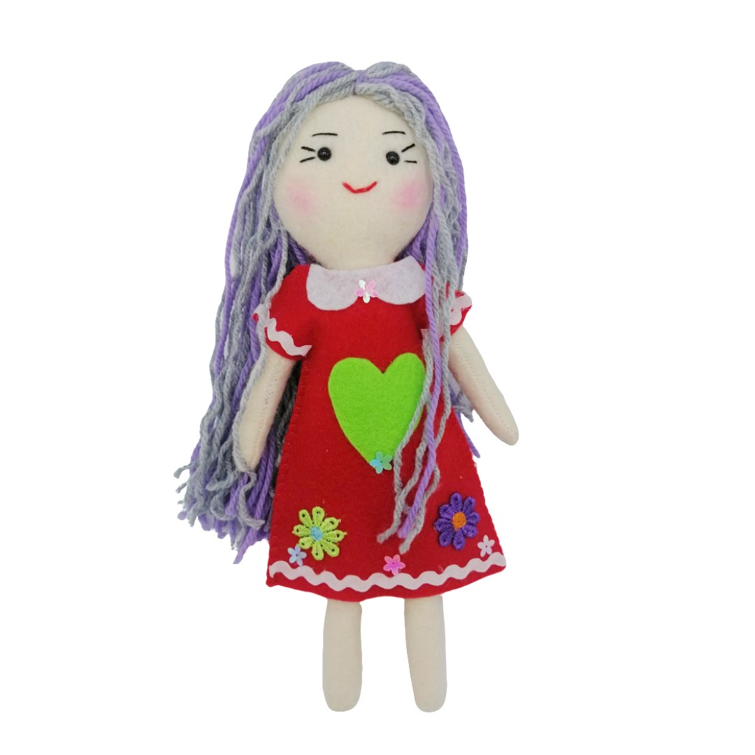 Papusa cu par lung mov, cu rochie rosie, din fetru