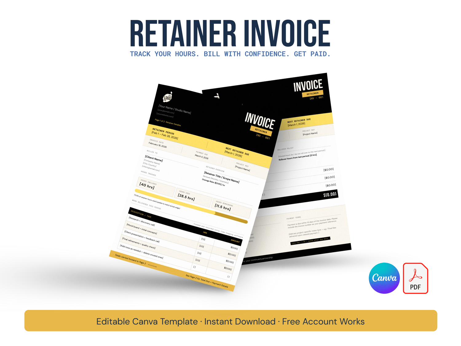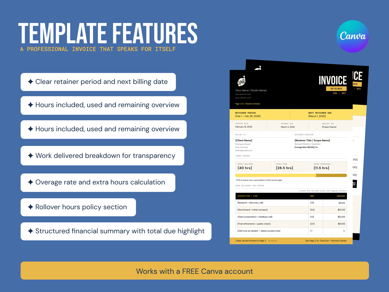 This template is fully editable in Canva and designed specifically for retainer work where the same client is billed on a recurring basis and consistency matters.