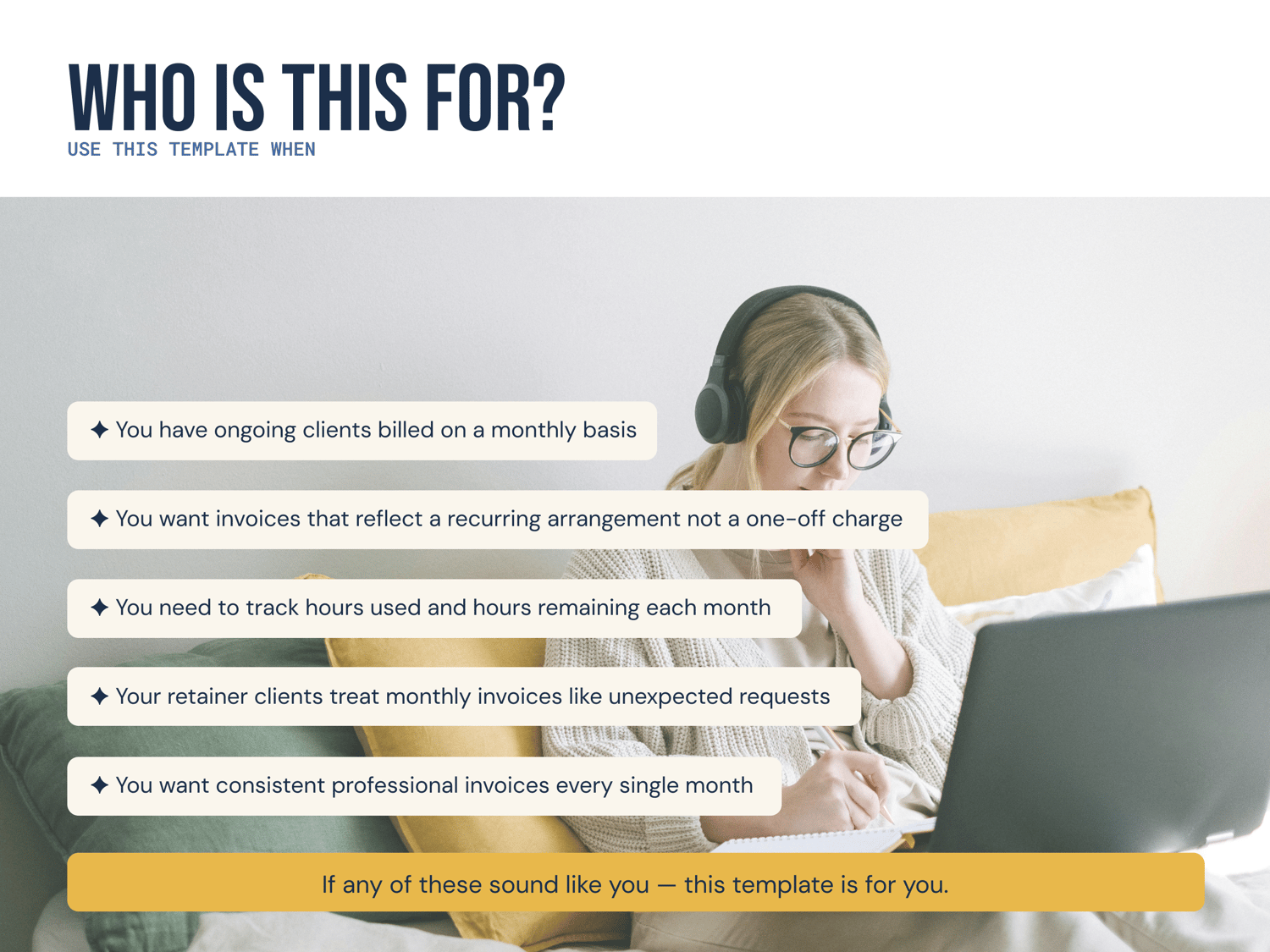 ✦ Anyone on a retainer arrangement who wants invoicing to feel as professional as the relationship