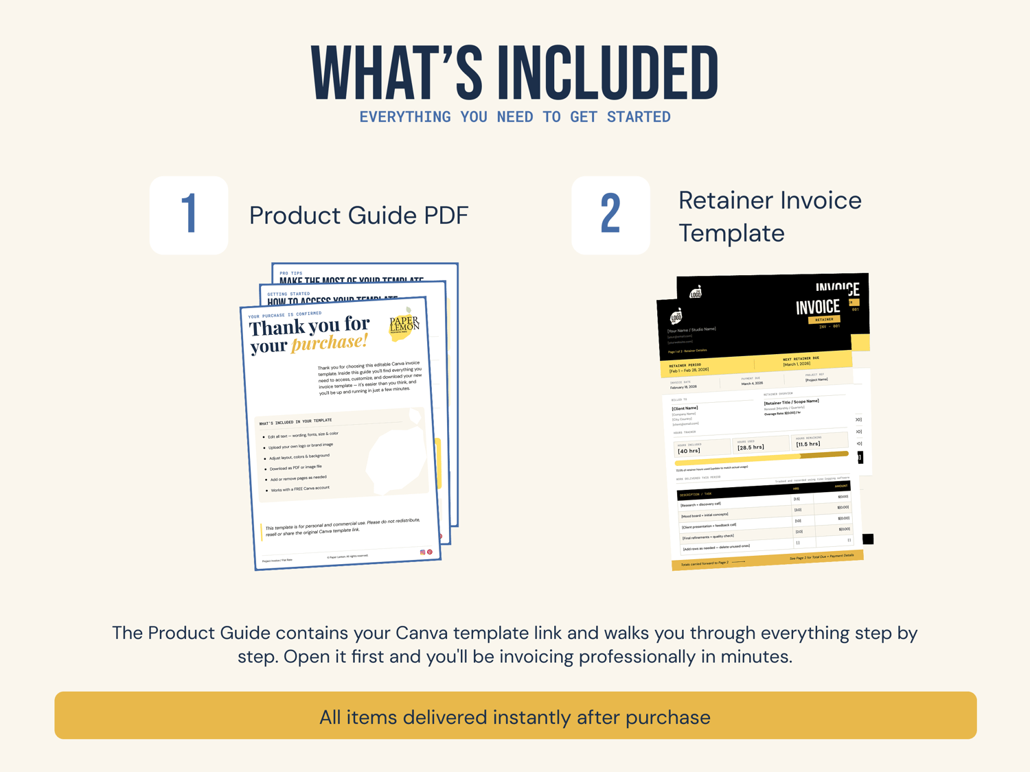 ✦ Retainer Invoice Template: fully editable in Canva with billing period and hours tracking built in, ready to send as PDF ✦ Product Guide PDF: contains your Canva template link and walks you through everything step by step