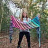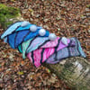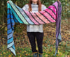 The Winter Wonder Wrap is a long wrap knit on the bias. It is knitted in 24 sections so that you can use a mini skein countdown/advent calendar or your own 24 mini skeins. It can also be made out of one colour for the 24 sections and a contract for the bands in-between.