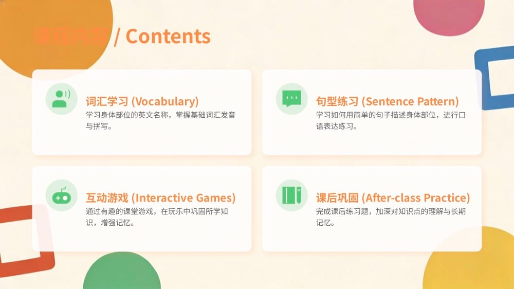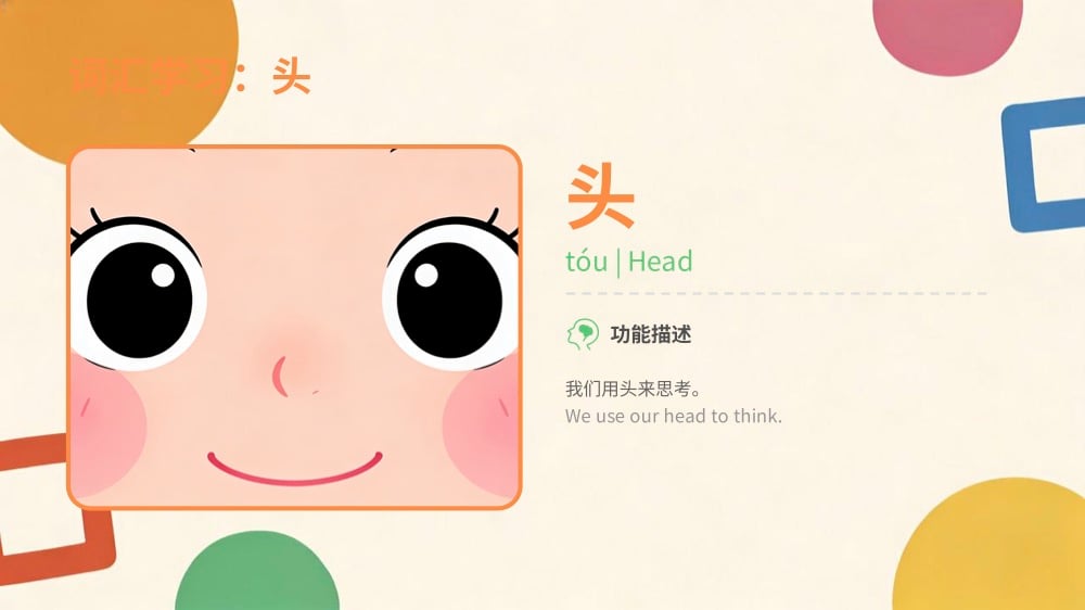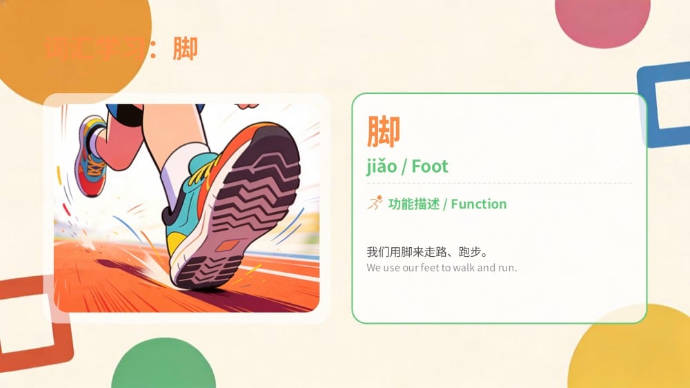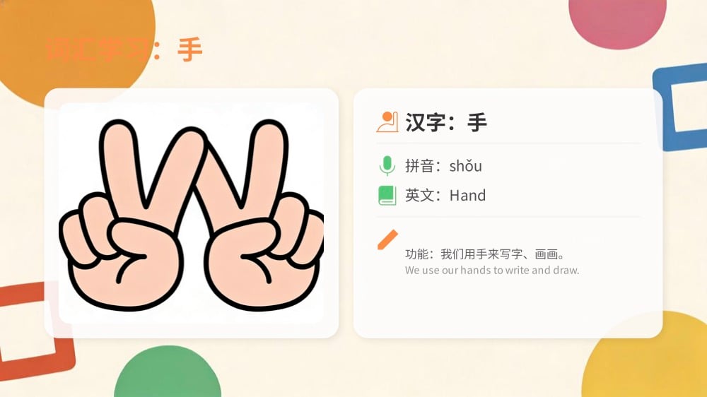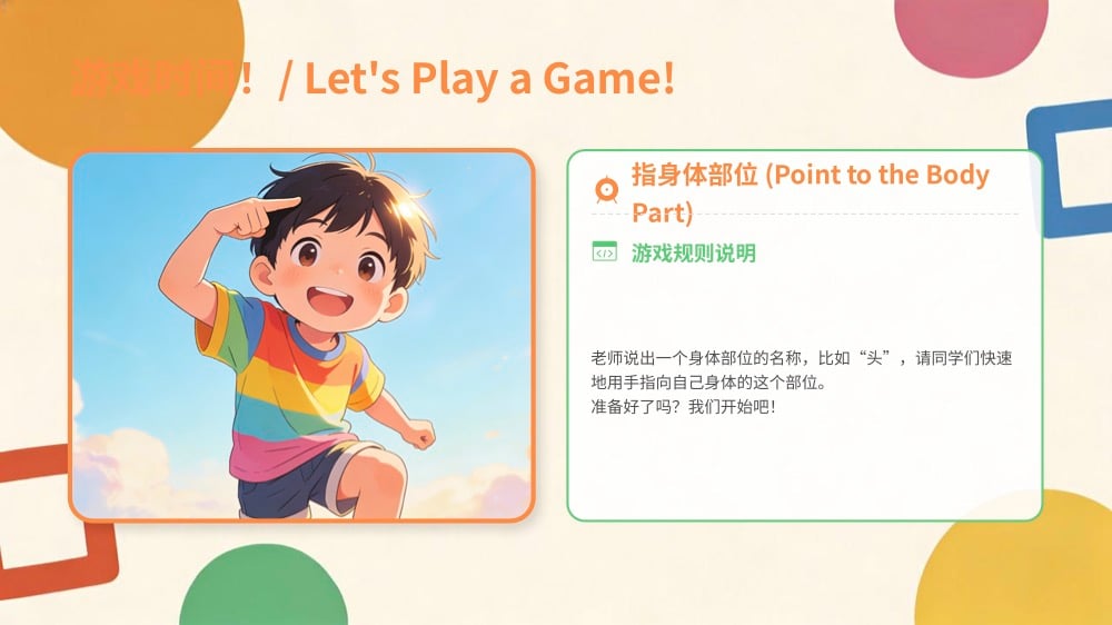In this beginner-friendly lesson, we will learn to say basic body parts like "head", "hand", "foot", and "eye" in Chinese! With vivid cartoon illustrations, simple English-Chinese translations, and engaging interactive games such as "Point to the Body Part" and "Simon Says", you will easily master these words and learn to describe them with simple sentences.