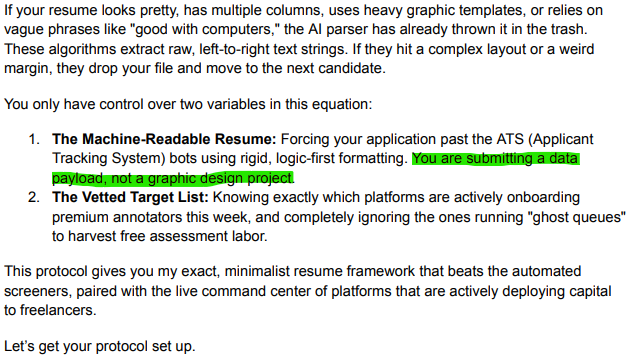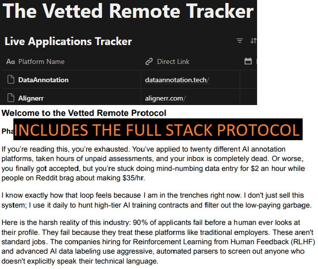 - The Vetted Remote Protocol: An 8-page master strategy guide on bypassing AI parsers, securing high-tier AI training contracts, and specialized machine-readable resume frameworks. Use this as your own premium lead magnet.