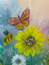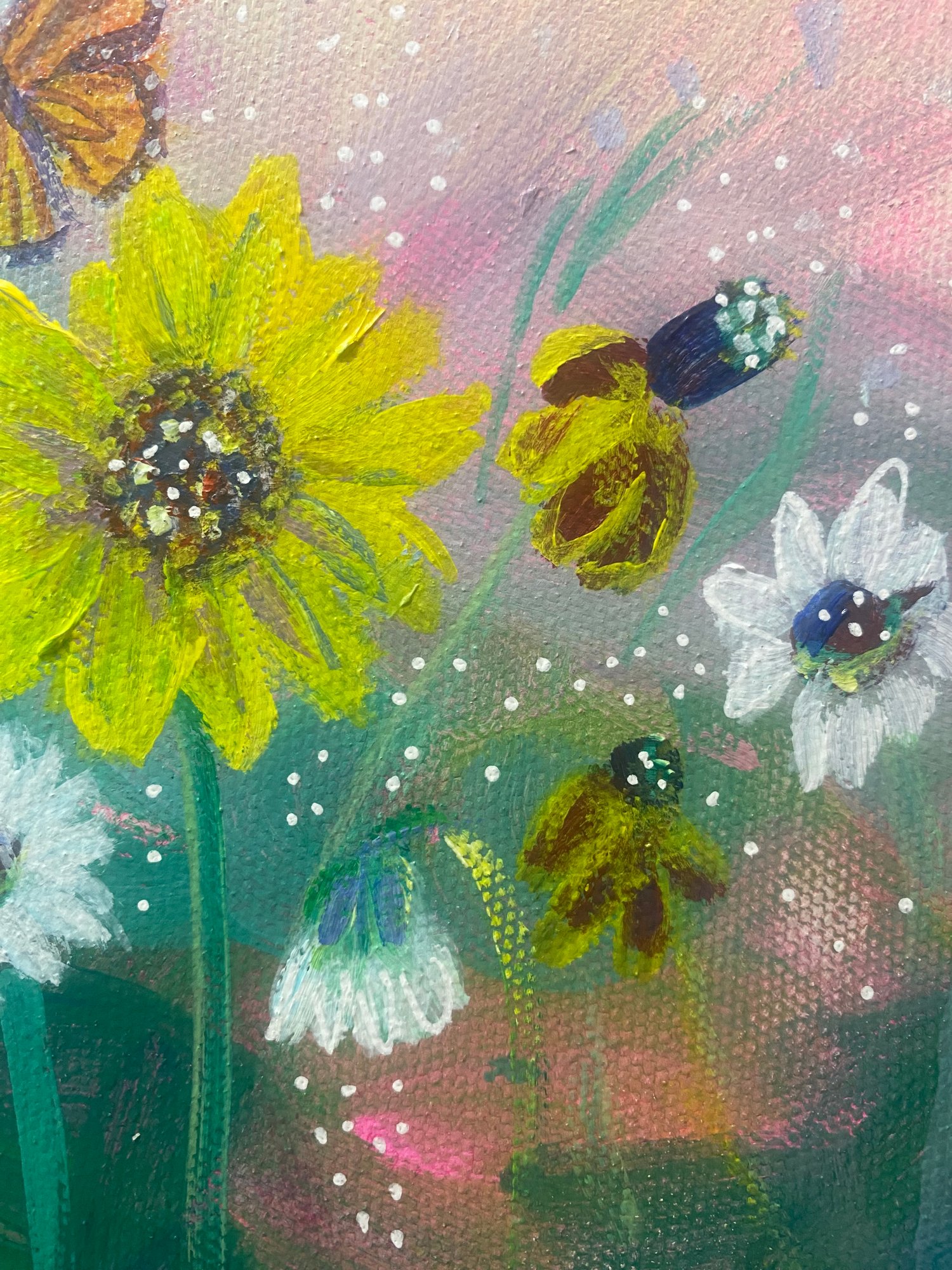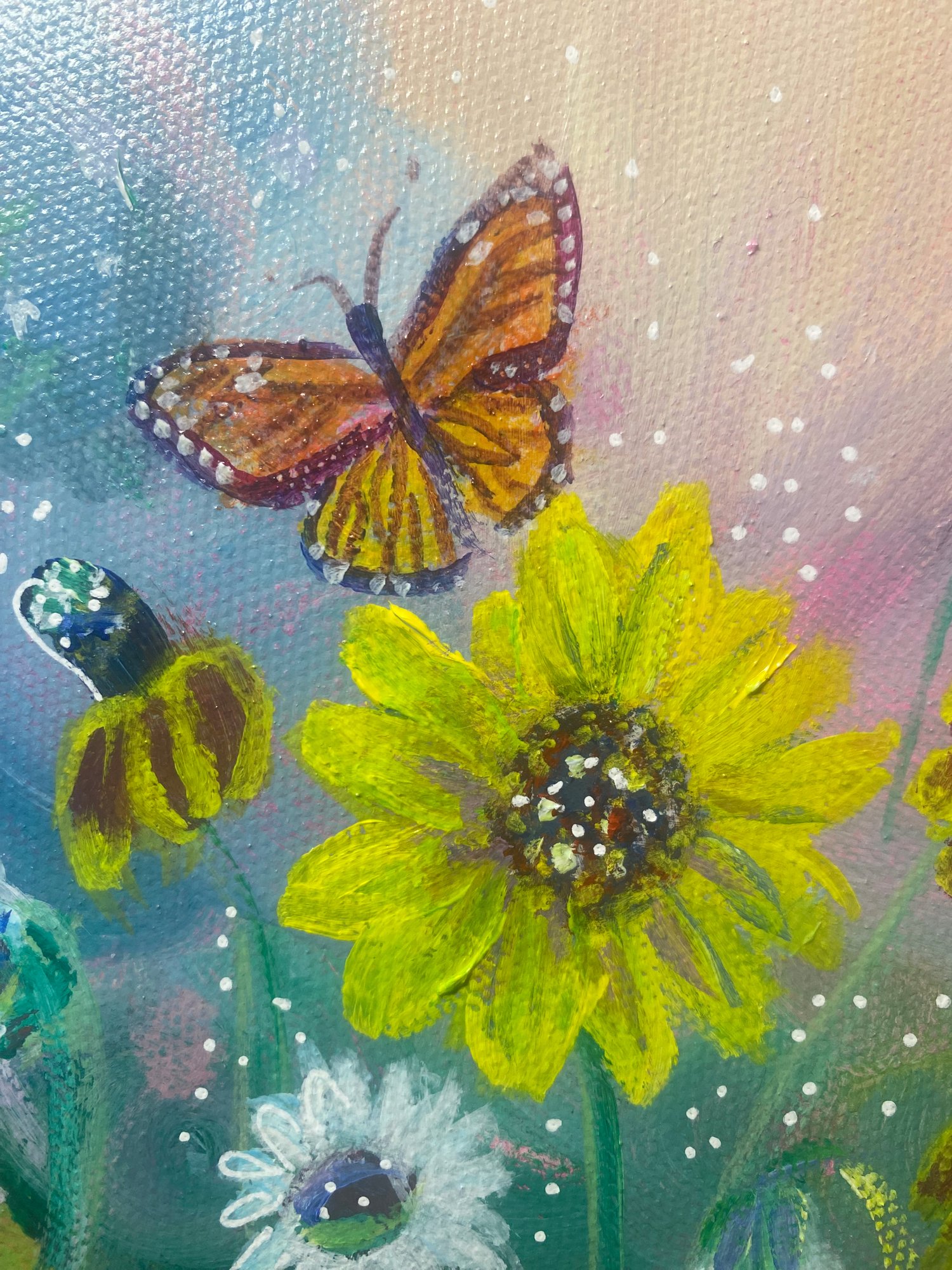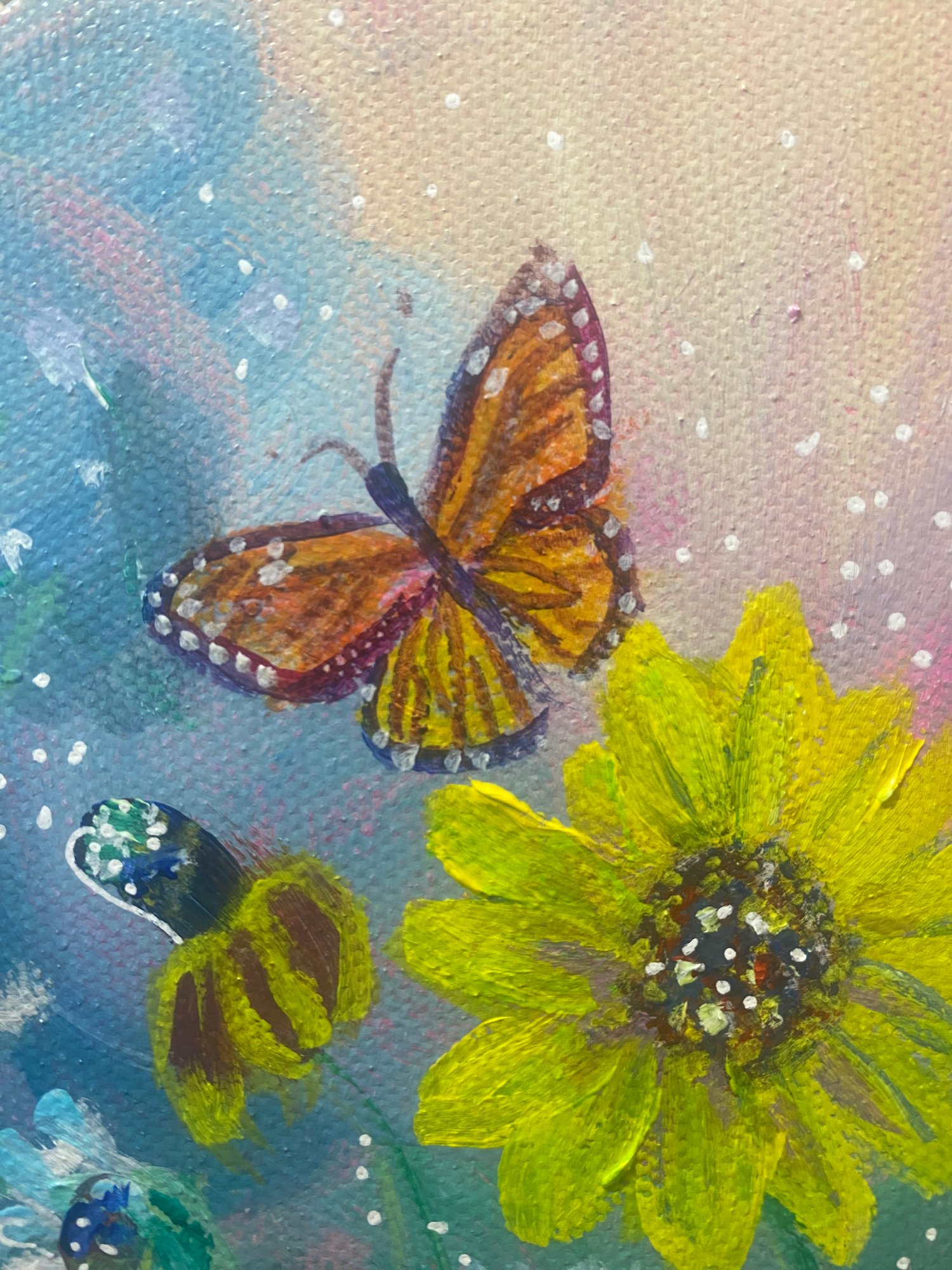 Magic is real — and this painting proves it. "Fairy Dust" captures that suspended moment when the garden holds its breath and everything shimmers. A monarch butterfly drifts above sunflowers and daisies while tiny dots of fairy dust float through a dreamy sky of blue, teal, pink and gold. Look closely and you will find jewel-like details hidden in every flower center — small surprises waiting to be discovered, just like magic itself.