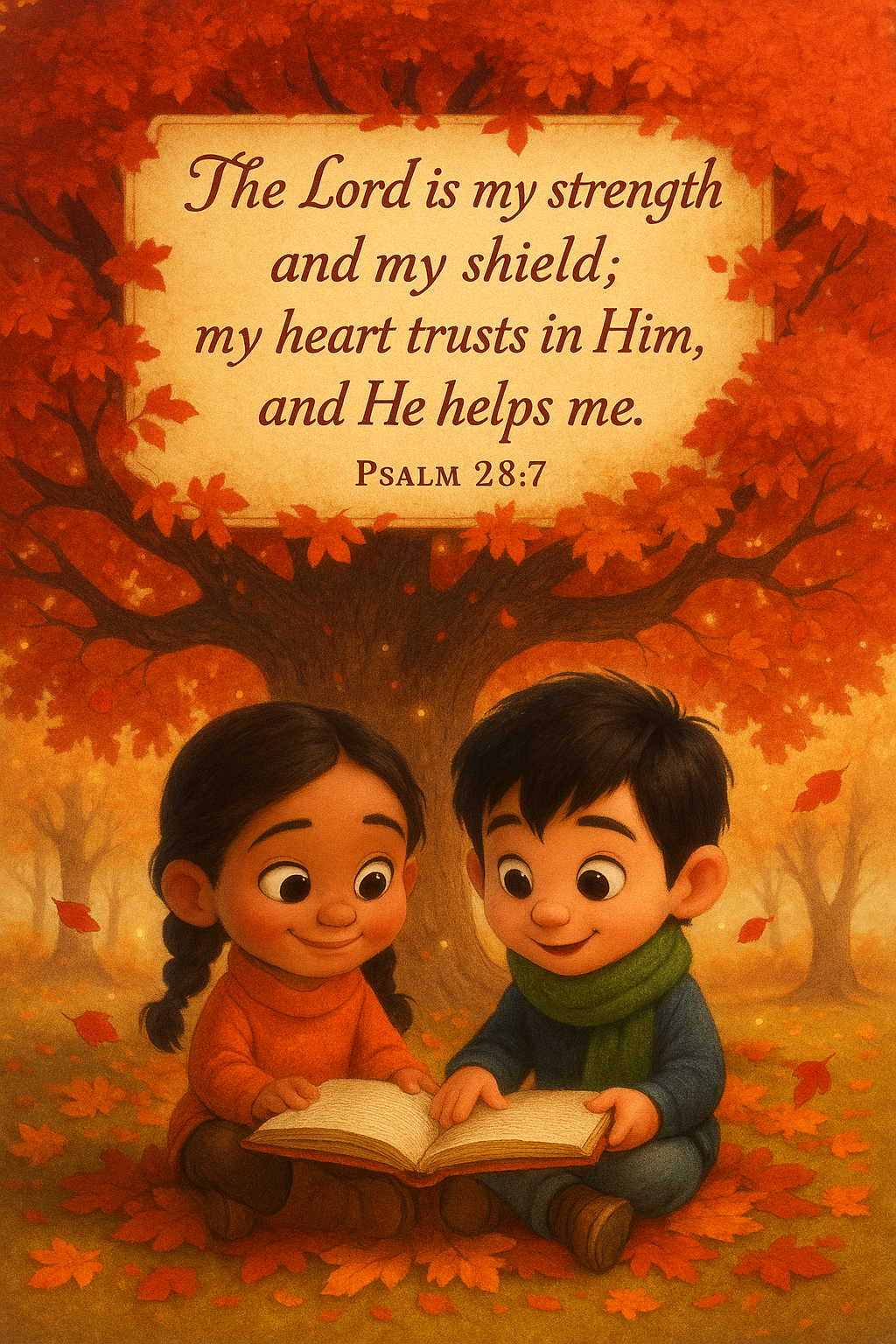 Celebrate divine protection and heartfelt trust with this Trust & Shield Scripture Poster, featuring two children reading together beneath a radiant autumn tree. Surrounded by fallen leaves and warm forest light, this printable brings emotional depth and spiritual comfort to any space — anchored in Psalm 28:7, it’s perfect for Thanksgiving bundles, homeschool walls, or ministry kits.