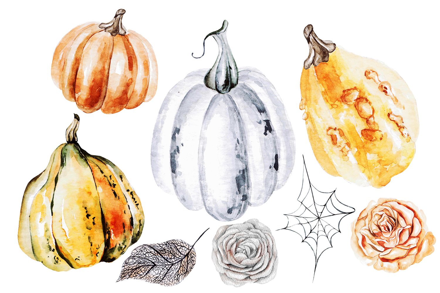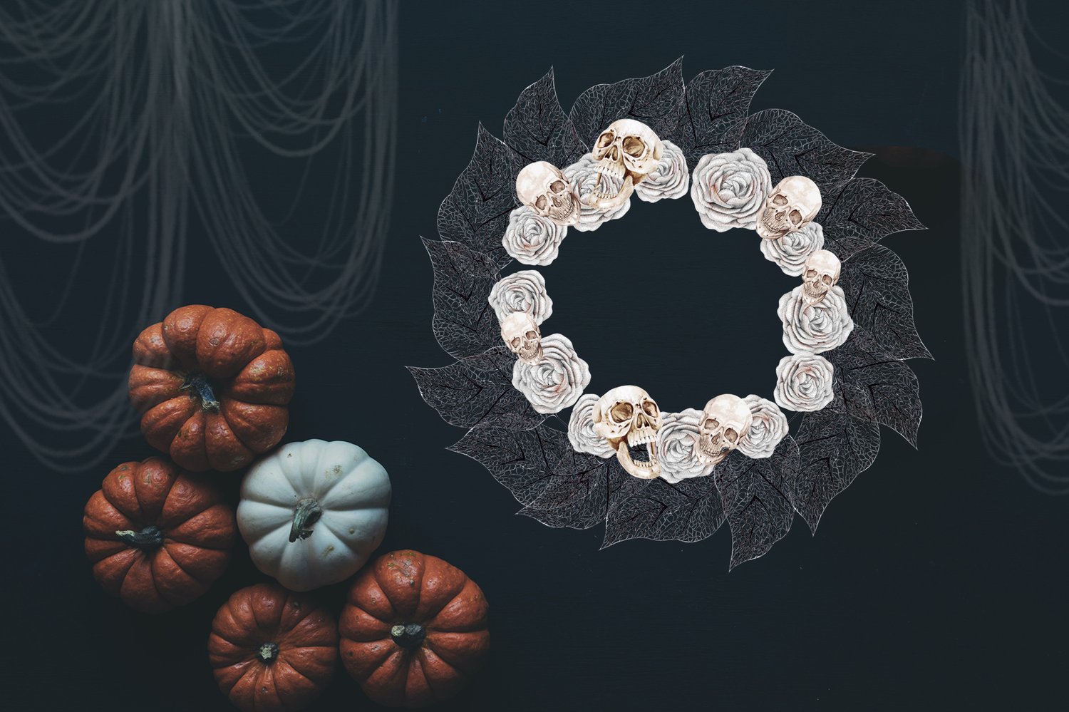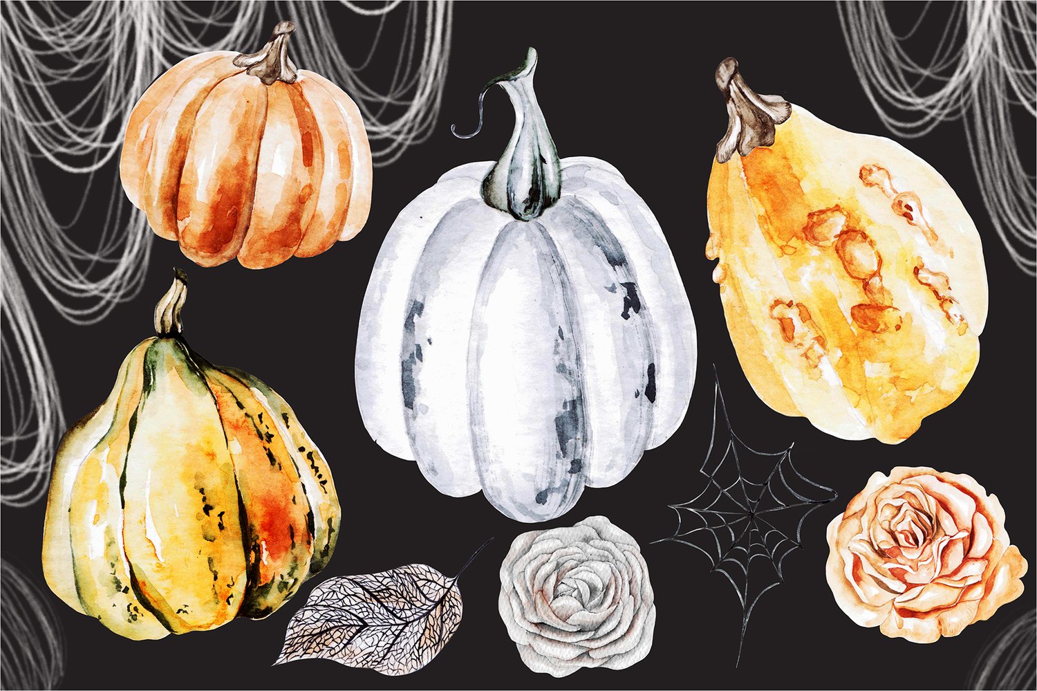I am glad to present you a new collection of Halloween. Different pumpkins, black leaves, roses. Use a set for cards, design, patterns, invitations and other which wish your imagination. The product also includes ready-made 1 wreath and 2 bouquet, 3 patterns. You will get: