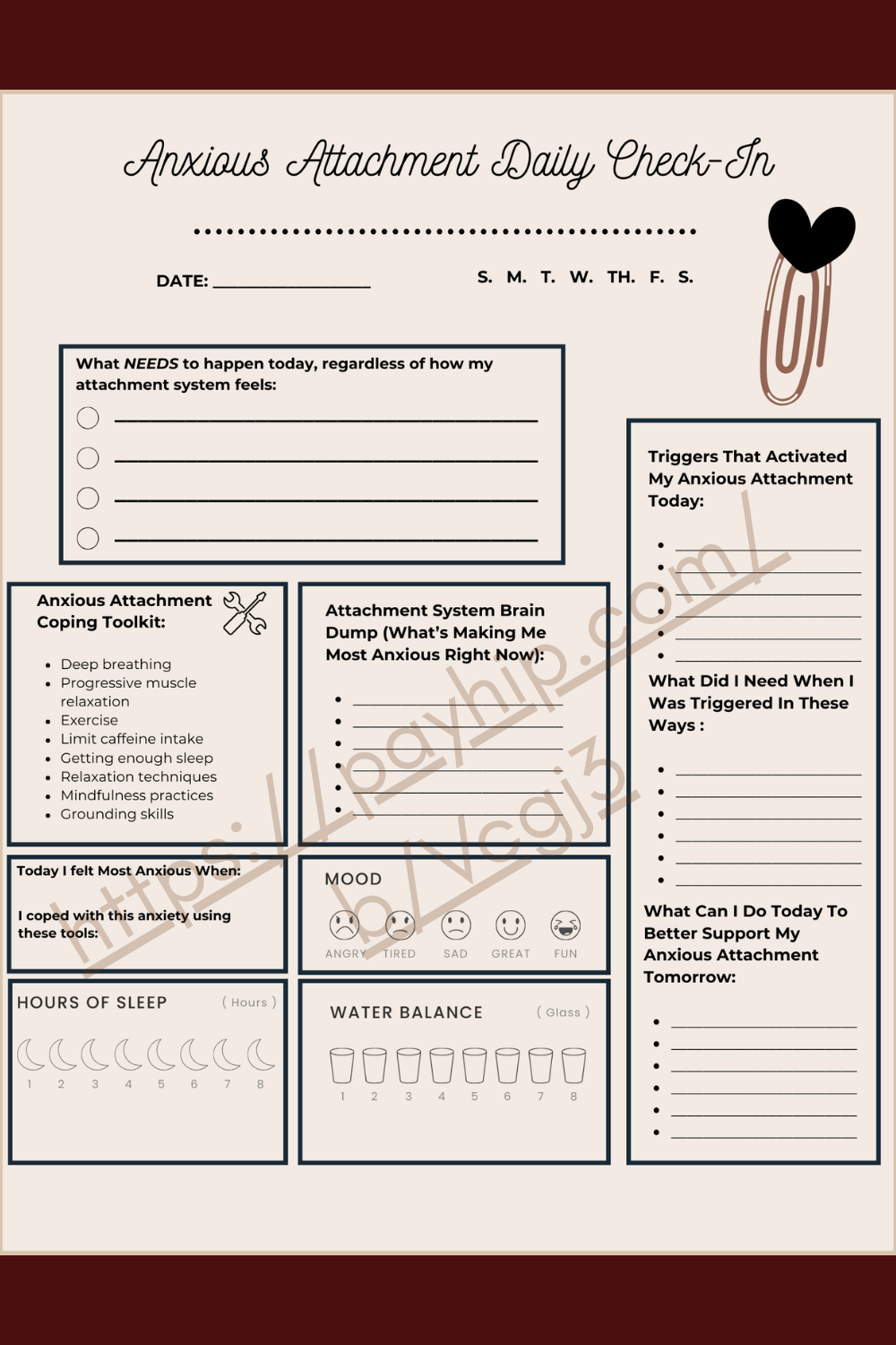 If you're working on better understanding your anxious attachment system, this daily check-in can be a helpful tool in identifying moments where your anxious attachment system gets activated, identifying what parts of your life need to carry on regardless of how your attachment system feels, ways to check-in on self-care, and strategies to cope with an anxious attachment system being activated