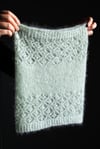 Soft As Starlight is a lightweight cowl inspired by the fleeting brilliance of meteor showers. Featuring a delicate lace motif reminiscent of shooting stars, this ethereal cowl is knit in a single strand of lace-weight silk mohair, creating a soft and airy fabric.