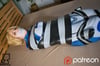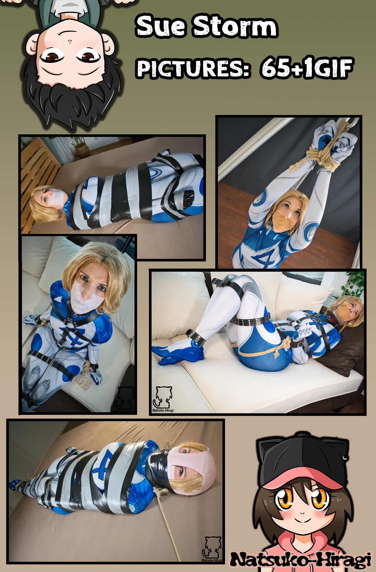 Picture set includes: Leucoplast tapegag, sock stuffgag, fixomull tapegag (plastergag), pantyhood, wrap around tapegag, suspension bondage, socked feet, c. form, belt bondage, leather bondage, leather harness, leather collar, leashed, heavy taped bondage, tied to a bed, mysterious fog