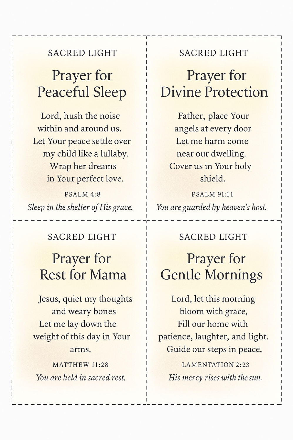 Bring peace, comfort, and spiritual rhythm to your day with this Sacred Light Mini Prayer Card Sheet, featuring four gentle prayers rooted in scripture. Designed for families, caregivers, and ministries, these cards offer daily encouragement for sleep, protection, motherhood, and morning grace.