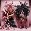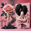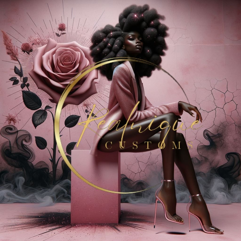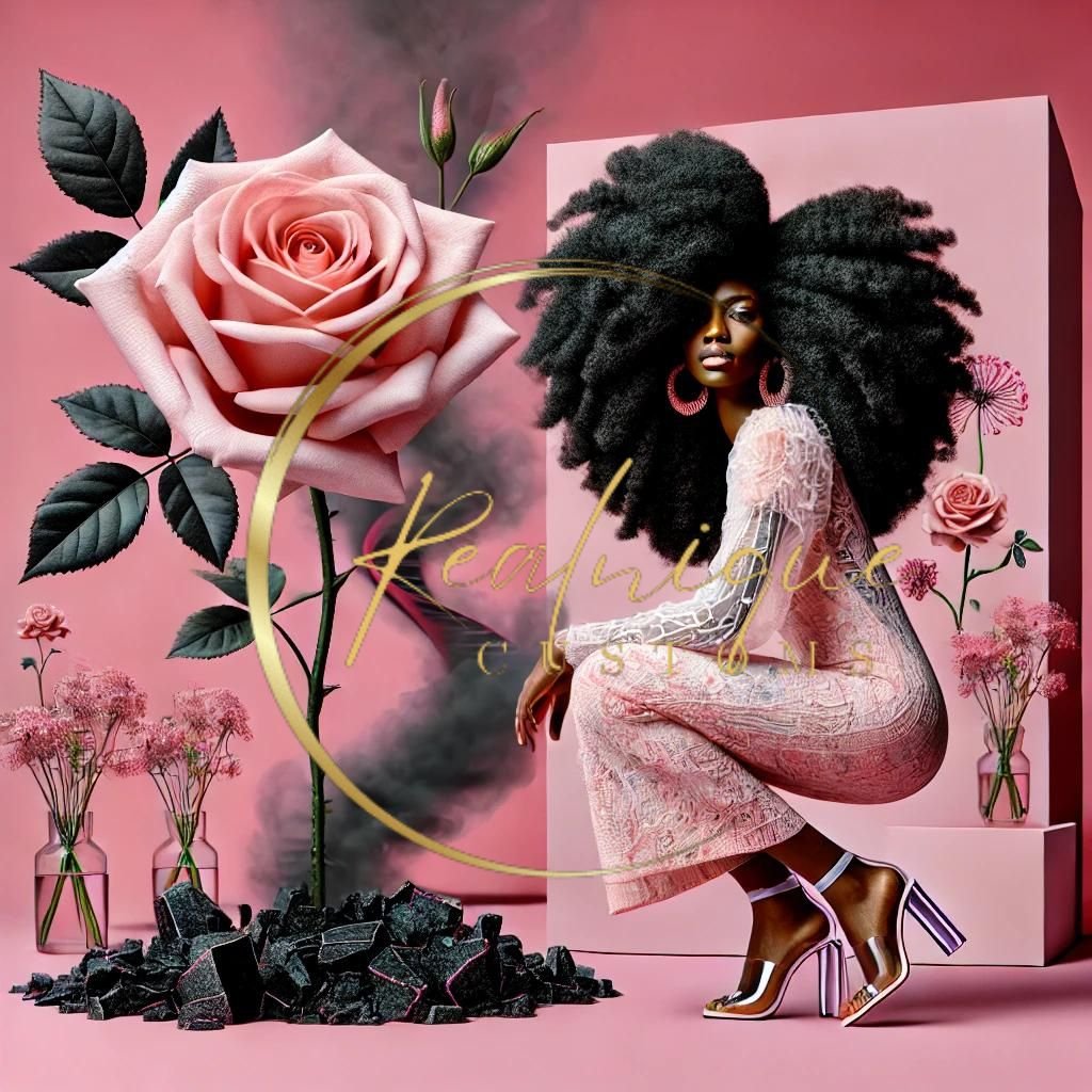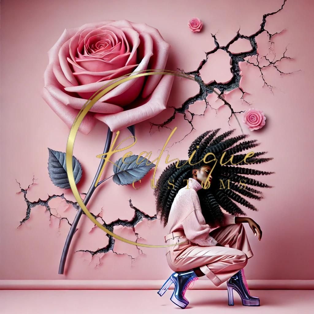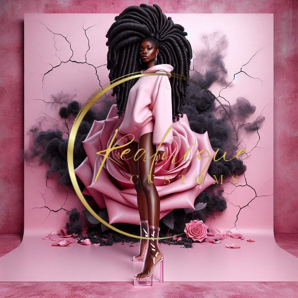 This captivating collection of five images features an African American woman with voluminous Havana twists, striking a minimalist pose against a vibrant pink backdrop. The oversized rose and smoky black cracks add a dramatic flair, while her translucent high heels embody a perfect balance of toughness and grace. Each image in the collection uniquely captures the essence of punk fashion fused with modern elegance, making it a bold statement piece.