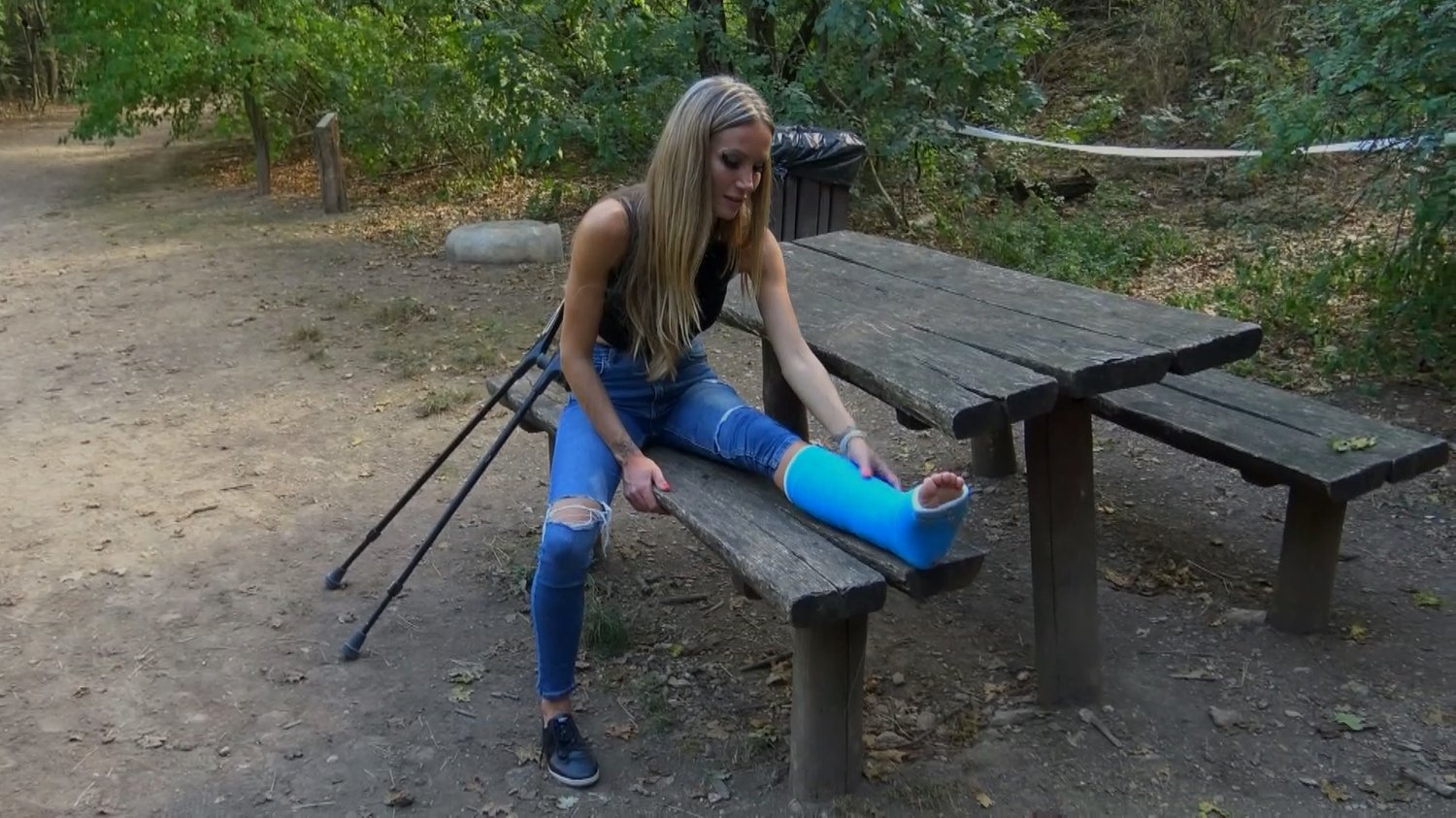This clip is starting off by shooting a closeup of Tatjana in the woods as she’s sitting on a bench with her blue SLC. Tatjana went out to practice with her new crutches that she got for her broken leg, she thought some crutching out here would do her some good, but it turned out to be a bad idea. Who knew it would be this exhausting to crutch on rough ground and bad trails? When Tatjana was done resting and we’ve got plenty of closeups until now as well. She gets back up and slowly crutches as the camera is filming from a nice front view, observing closely as she takes one gently step at a time. Even though she’s being extra careful out here today, Tatjana still nearly tripped once but kept on crutching steady and calm, she’s not making a big deal out of it and kept on crutching deeper into the forest. The trails got more and more rough as the roots of some trees had overgrown some parts of the way as well, forcing Tatjana to almost crutch in a slow motion pace. The time passes by as she calmly crutches throughout the entire area and safely gets back to the car without hurting herself.