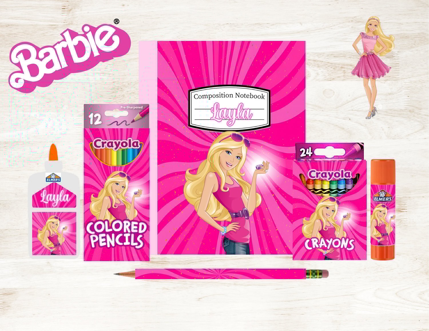 Personalized Barbie School Supplies Set | Custom Name Notebook + Crayons, Pencils & Glue | Barbie Themed Back-to-School Kit