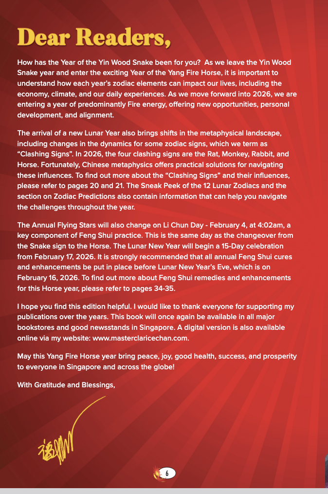Make 2026 your most successful and auspicious year yet with Master Clarice Chan’s Guide to 2026 – The Yang Fire Horse Year!