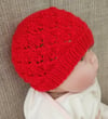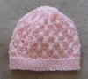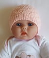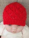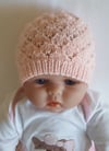 This 4ply baby Beanie has a 1x1 rib band, is worked in a lovely lace stitch then has a stocking stitch crown.